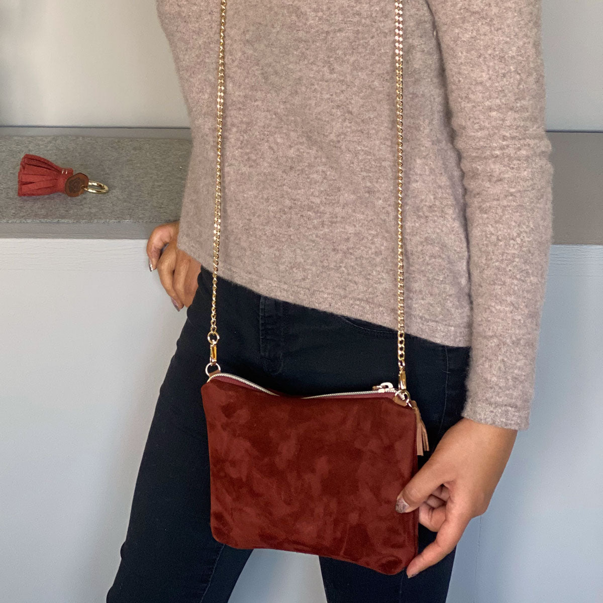 Sweet Sofia ist eine modische Umhängetasche der Marke Dorothee Lehnen. Das wandelbare Accessoire mit den Maßen 20 x 17 x 3 cm rundet jedes Outfit ab und wird garantiert zur Lieblingstasche. Kombinieren Sie die kleine Umhängetasche zum nächsten Stadtbummel mit einem leichten Sommerkleid und Sandalen oder einer coolen Lederjacke, Jeans und Sneakern für einen lässigen Alltagslook. Sorgen Sie für einen eleganten Auftritt am Abend, indem Sie die Goldkette entfernen und Sweet Sofia in eine schicke Clutch verwandeln. Die stilvolle Tasche ist aus butterweichem Nubukleder, zu dessen Herstellung glattes Rinderleder mit einem speziellen Schleifverfahren bearbeitet wird. Das Ergebnis ist ein feines Rauleder, das sich durch eine besonders weiche und samtige Haptik, die Wildleder ähnelt, auszeichnet. Nubukleder vergoldet als hochwertiges und edles Naturmaterial, das die Minitasche Sweet Sofia zu einem ganz besonderen Accessoire werden lässt. Ein separates Steckfach im Inneren sorgt für ausreichend Ordnung, während die goldfarbene Kette einen modernen Look verleiht.