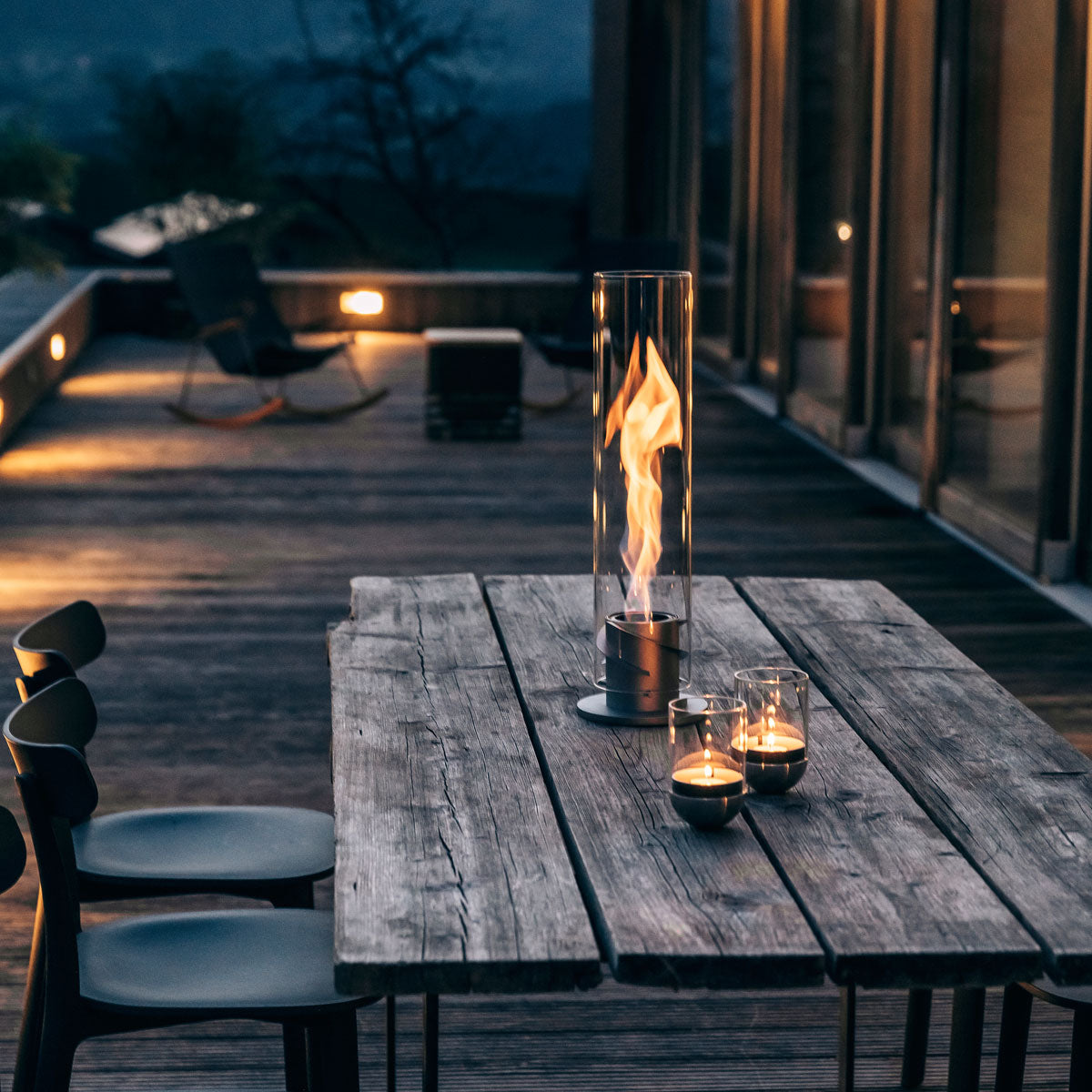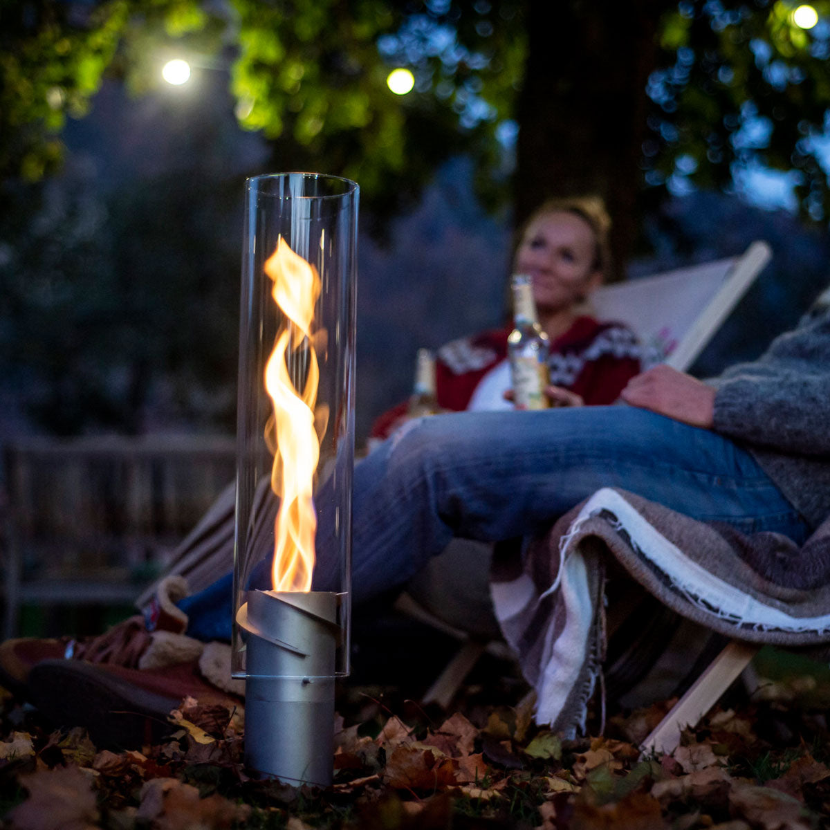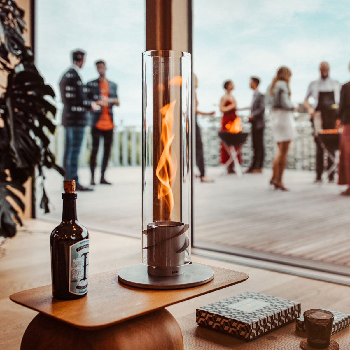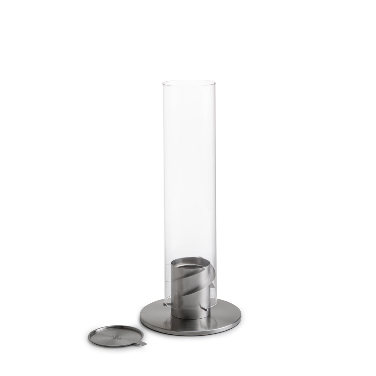SPIN besteht aus einem Gehäuse aus Edelstahl und einem dekorativen Glaszylinder aus Borosilikatglas. Die Nachfülldose im Inneren des Gehäuses wird mit Bioethanol befüllt und dann entzündet, bevor der Zylinder aus Glas wieder auf den Standfuß gesetzt wird. Unter der Verwendung von höfats Bioethanol wirbelt das Feuer geruchlos und rauchfrei für etwa eine Stunde. Mithilfe des im Lieferumfang enthaltenen Löschdeckels kann die Flamme natürlich auch schon früher gelöscht werden. Dafür einfach den Löscher auf den Zylinder legen, sodass das Feuer erstickt.