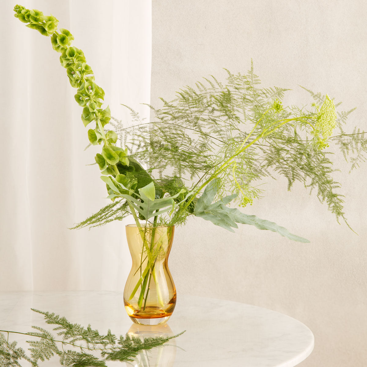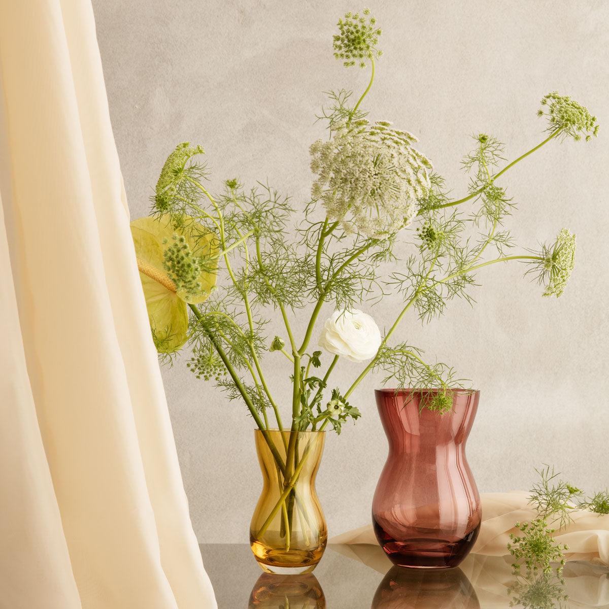 Angetrieben von seinem einzigartigen Verständnis für Glaskunst und inspiriert von der Natur hat Peter Svarrer im Auftrag von Holmegaard einen modernen Klassiker geschaffen: Die Calabas Vase. Die runde Form der mundgeblasenen Glasvase ist dem Flaschenkürbis, der sogenannten Kalebasse, nachempfunden, dessen getrocknete Hülle in vielen Teilen Nord- und Südamerikas als Gefäß zur Aufbewahrung von Flüssigkeiten verwendet wird. Als formschöne Blumenvase in Glas interpretiert, erfüllt sie einen ebenso funktionalen Zweck. Der bauchige untere Teil bietet stets Platz für ausreichend Wasser, die schmale Taille hält Stiele jeglicher Art fest an Ort und Stelle, während die leichte Öffnung nach oben hin Blüten auf besonders schöne Weise zur Geltung kommen lässt. Optisch besticht die dekorative Glasvase in entweder warmem Amber oder kühlem Burgundy. Die bernsteingelbe Calabas hat einen Durchmesser von 9 cm und eine Höhe von 16 cm. Sie eignet sich vor allem für kleine, niedliche Blumensträuße. Die burgunderfarbene Calabas hat einen Durchmesser von 13 cm und eine Höhe von 21 cm. Sie eignet sich damit wunderbar für üppige Blumensträuße. Ganz gleich, für welches Design Sie sich letztlich entscheiden, fest steht die Holemgaard Vase Calabas schafft mit ihrer organischen Form und sanften Farbgebung eine stets stilvolle Grundlage für Sträuße aller Art.