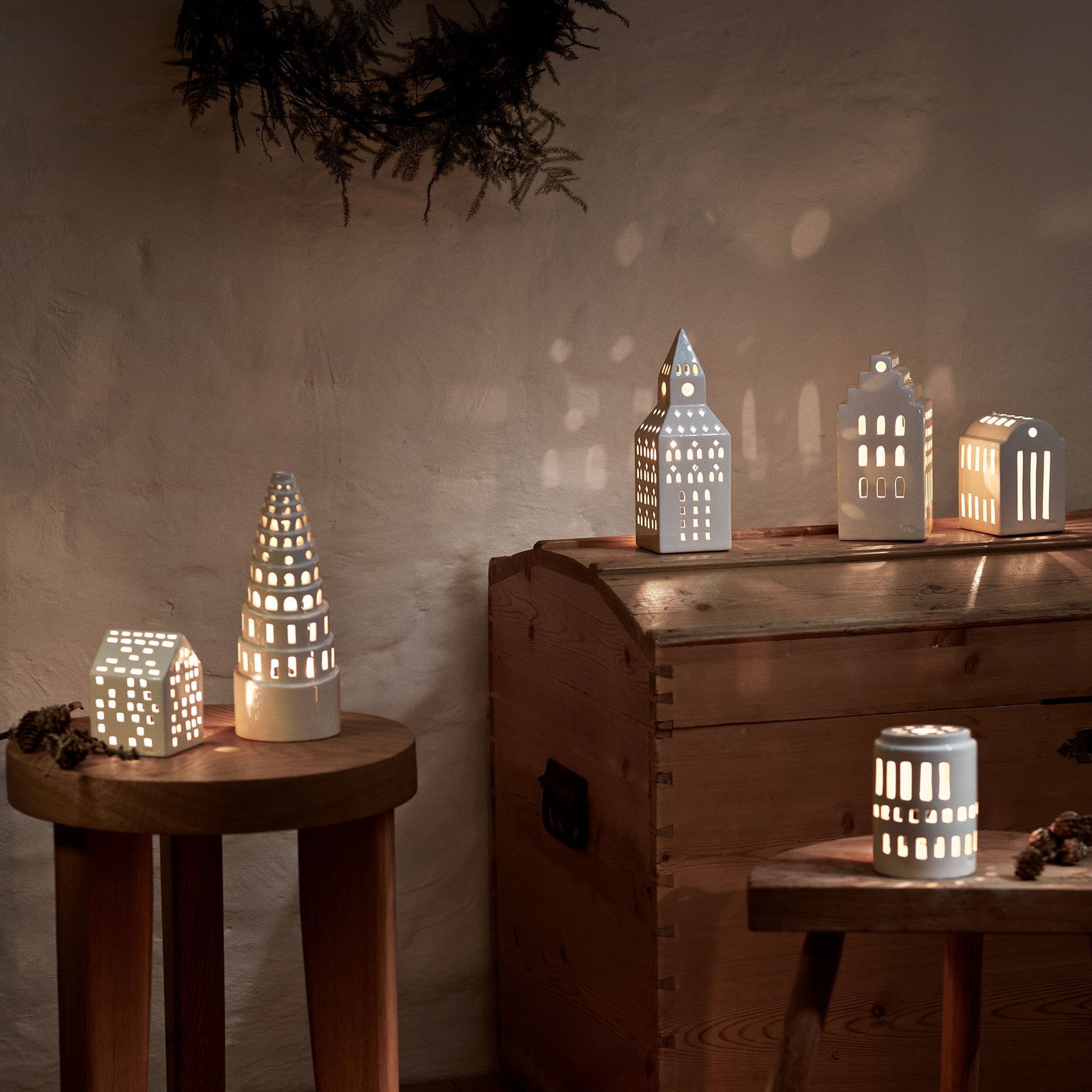 Die Lichthäuser Urbania von Kähler Design laden zum Sammeln und Städte bauen auf moderne Art ein. Sie zeichnen sich durch ihr ganz besonderes Design aus und sind allesamt Unikate. In echter Handwerkskunst werden alle Fenster per Hand ausgeschnitten, was jedes Stück einzigartig macht. Mette Bache und Barbara Bendix Becker entwerfen für das dänische Traditionsunternehmen Kähler Design schmucke Häuser, Türme und Kirchen in unterschiedlichen Größen und Formen. Aber eins haben alle gemein - sie sind aus weisser Keramik und mit einem Teelicht beleuchtet wirken sie je nach Betrachtungswinkel immer anders. Die verschiedenen Lichthäuser sind einem bestimmtem Typus der modernen Architektur nachempfunden. Und wenn die Basilika sich zum Turm und das Atelier zur Galerie gesellt entsteht ein hübsches kleines beleuchtetes Städtchen. Die Lichthäuser verschönern nicht nur in der dunklen Jahreszeit ihre Fensterbank.