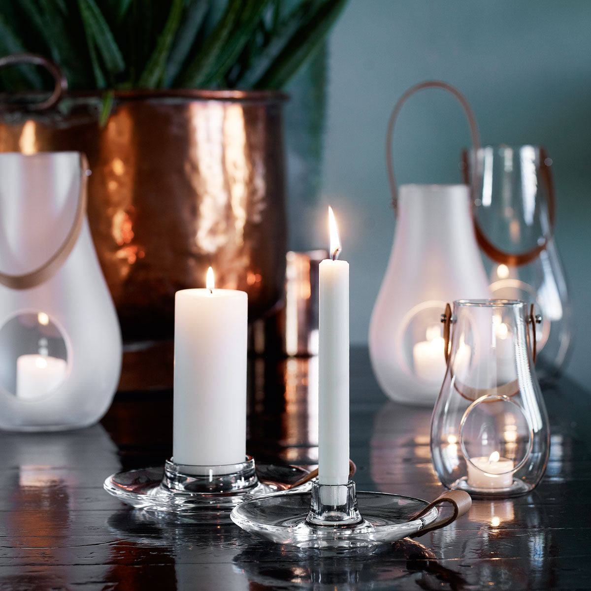 Die Designerin Maria Bersten hat dem klassischen Nachtlicht eine Verjüngungskur verpasst. Das Ergebnis: der Kerzenhalter aus der Serie Design with Light, der nicht nur beim Tragen gut in der Hand liegt, sondern auch auf jeder Tafel oder dem Fensterbrett als besonderes Design-Highlight punktet. Der zeitgemäße Scandi-Style wirkt aufgrund der Kombination aus Glas und Leder wunderbar modern und lässt alles in neuem Glanz erstrahlen. So ist die romantische Verbindung von Scandi und Retro alles andere als von gestern.