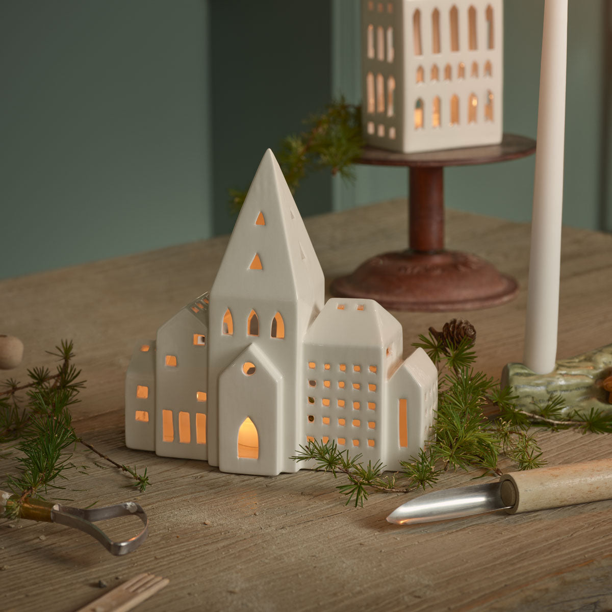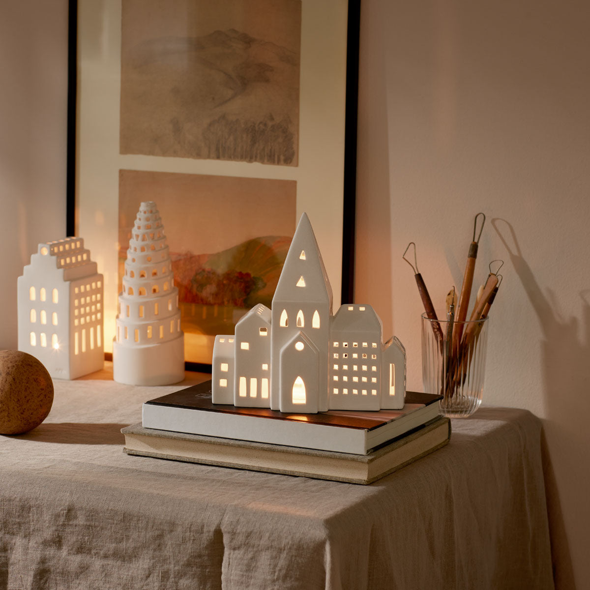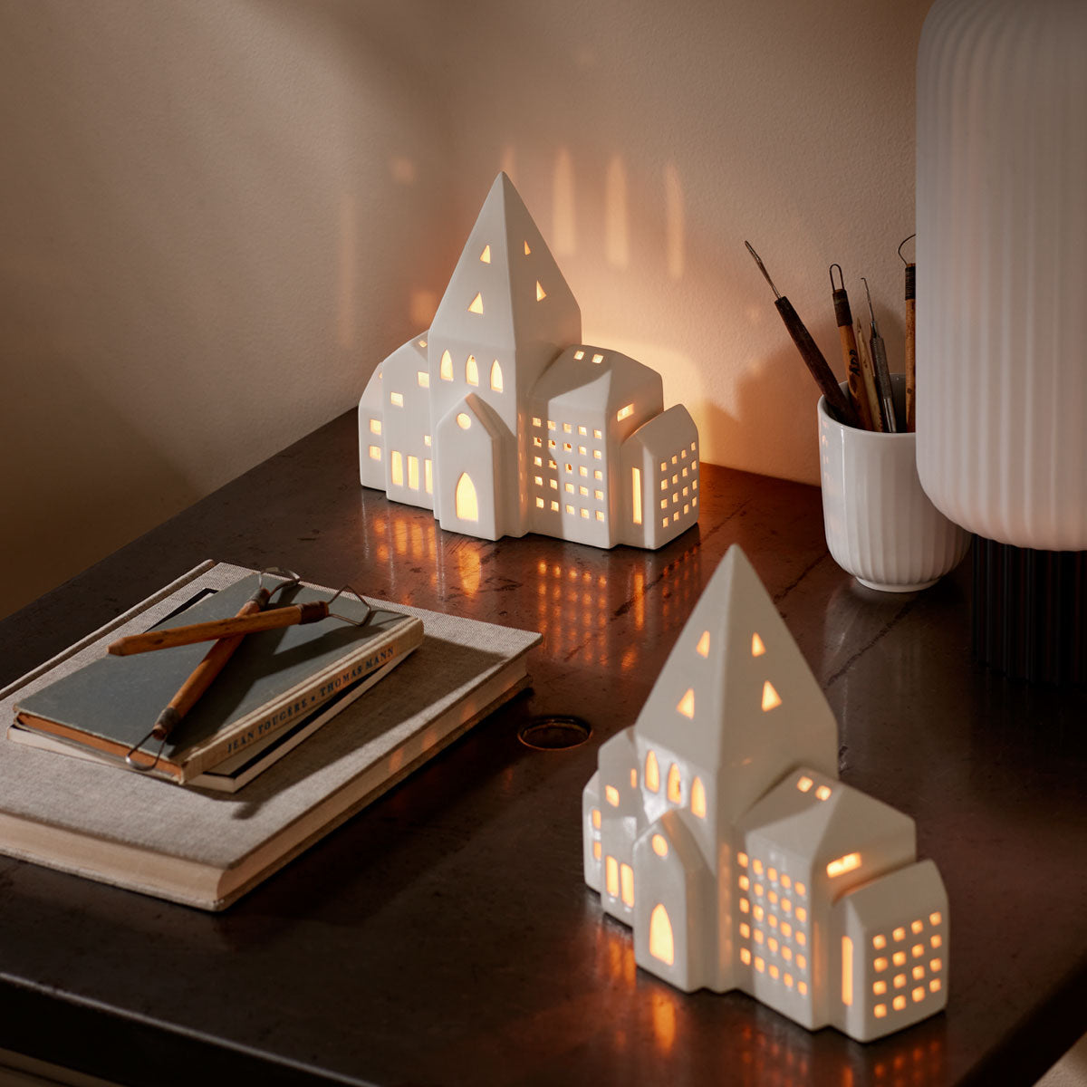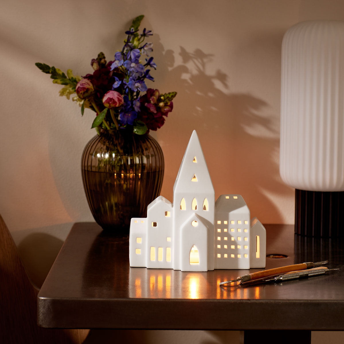 Die Lichthäuser Urbania von Kähler Design laden zum Sammeln und Städte bauen auf moderne Art ein. Sie zeichnen sich durch ihr ganz besonderes Design aus und sind allesamt Unikate. In echter Handwerkskunst werden alle Fenster per Hand ausgeschnitten, was jedes Stück einzigartig macht. Mette Bache und Barbara Bendix Becker entwerfen für das dänische Traditionsunternehmen Kähler Design schmucke Häuser, Türme und Kirchen in unterschiedlichen Größen und Formen. Aber eins haben alle gemein - sie sind aus weisser Keramik und mit einem Teelicht beleuchtet wirken sie je nach Betrachtungswinkel immer anders. Die verschiedenen Lichthäuser sind einem bestimmtem Typus der modernen Architektur nachempfunden. Und wenn die Basilika sich zum Turm und das Atelier zur Galerie gesellt entsteht ein hübsches kleines beleuchtetes Städtchen. Die Lichthäuser verschönern nicht nur in der dunklen Jahreszeit ihre Fensterbank.