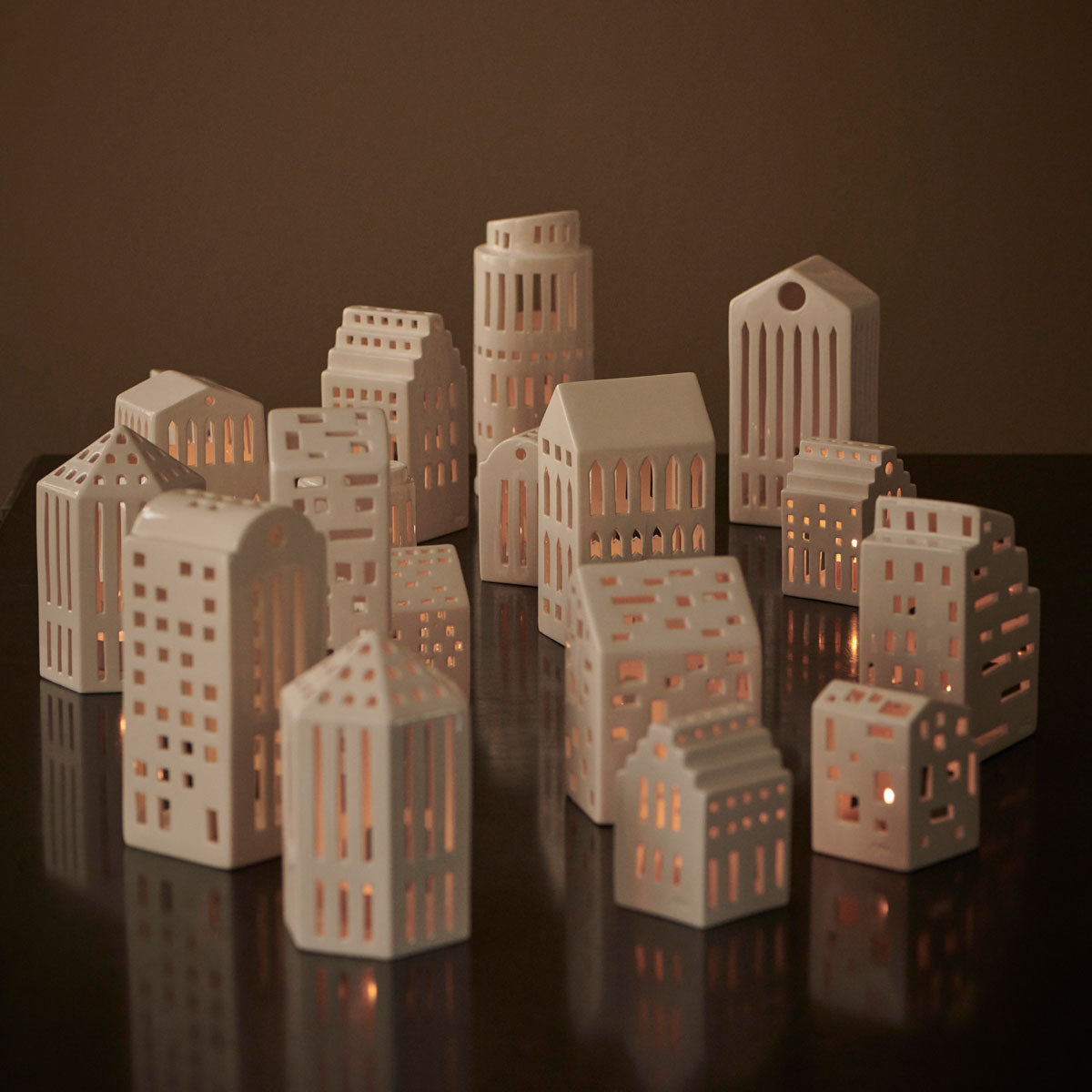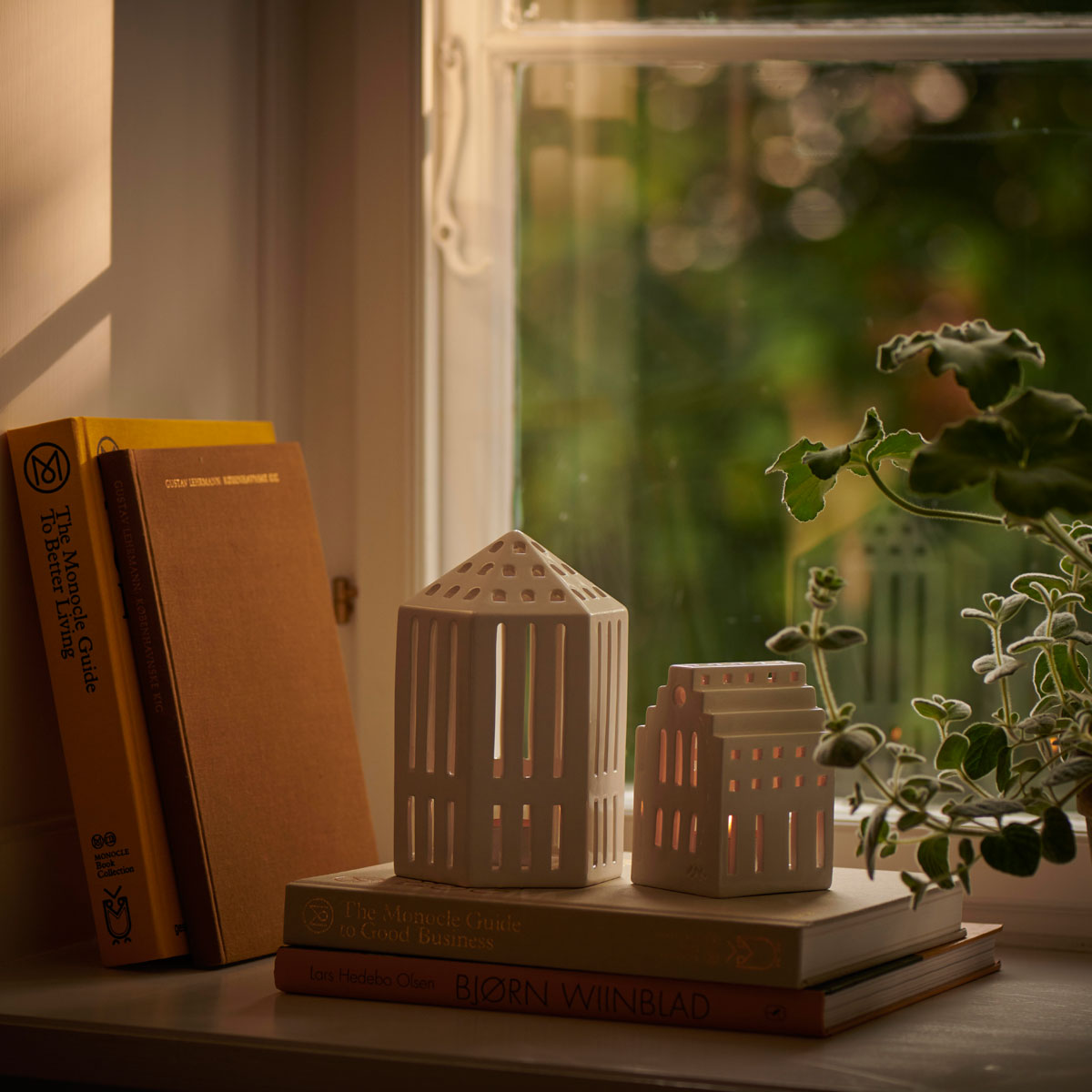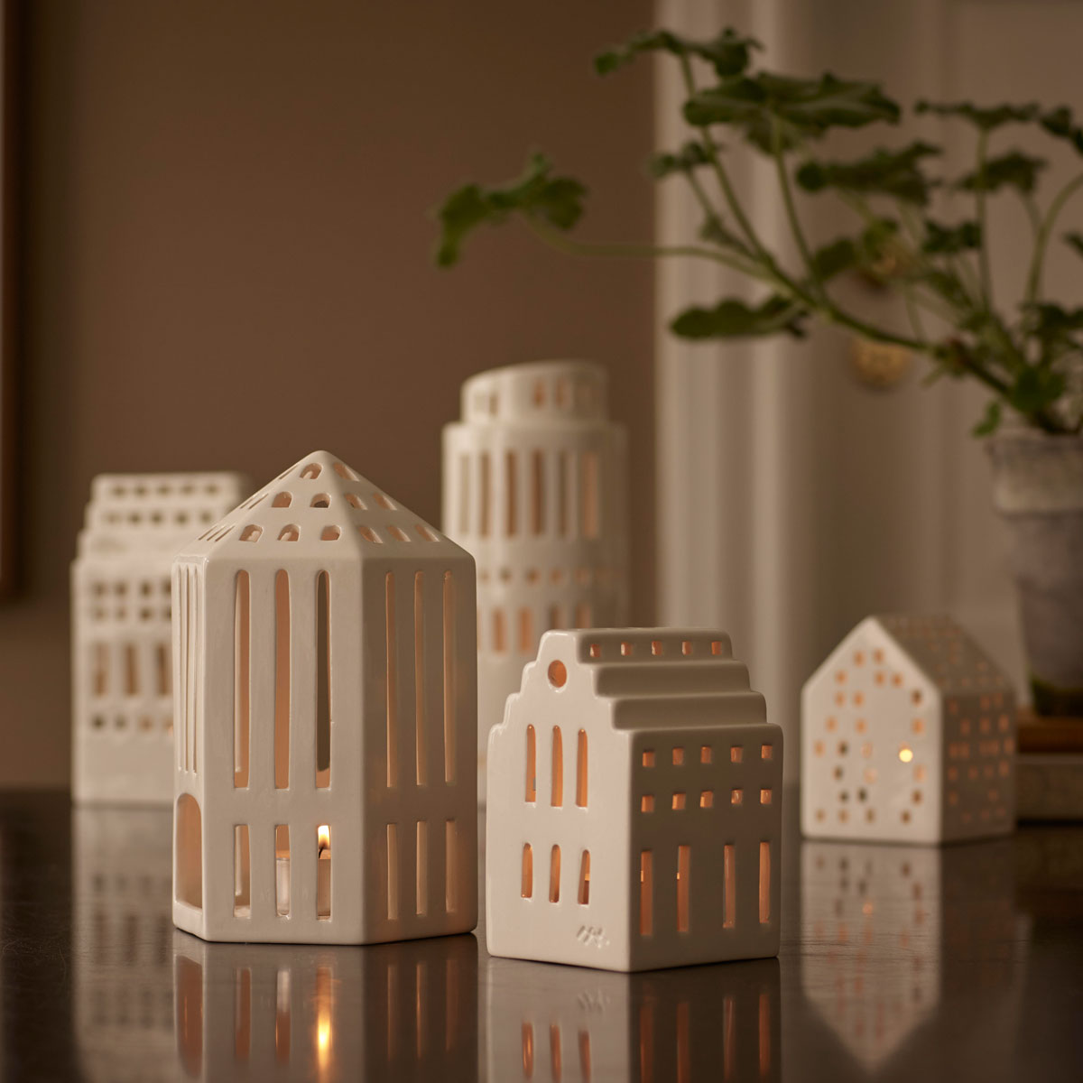 Die Lichthäuser Urbania von Kähler Design laden zum sammeln und Städte bauen auf moderne Art ein. Sie zeichnen sich durch ihr ganz besonderes Design aus und sind allesamt Unikate. In echter Handwerkskunst werden alle Fenster per Hand ausgeschnitten, was jedes Stück einzigartig macht. Mette Bache und Barbara Bendix Becker entwerfen für das dänische Traditionsunternehmen Kähler schmucke Häuser, Türme und Kirchen in unterschiedlichen Größen und Formen. Aber eins haben alle gemein - sie sind aus weisser Keramik und mit einem Teelicht beleuchtet wirken sie je nach Betrachtungswinkel immer anders. Die verschiedenen Lichthäuser sind einem bestimmtem Typus der modernen Architektur nachempfunden. Und wenn die Basilika sich zum Turm und das Atelier zur Galerie gesellt entsteht ein hübsches kleines beleuchtetes Städtchen. Die Lichthäuser verschönern nicht nur in der dunklen Jahreszeit ihre Fensterbank.