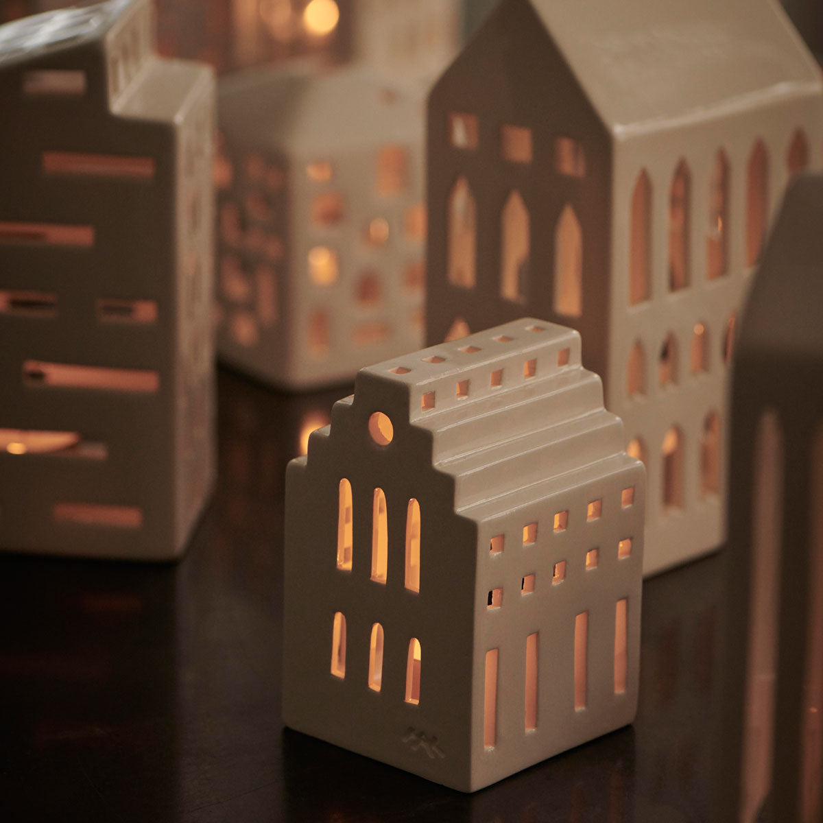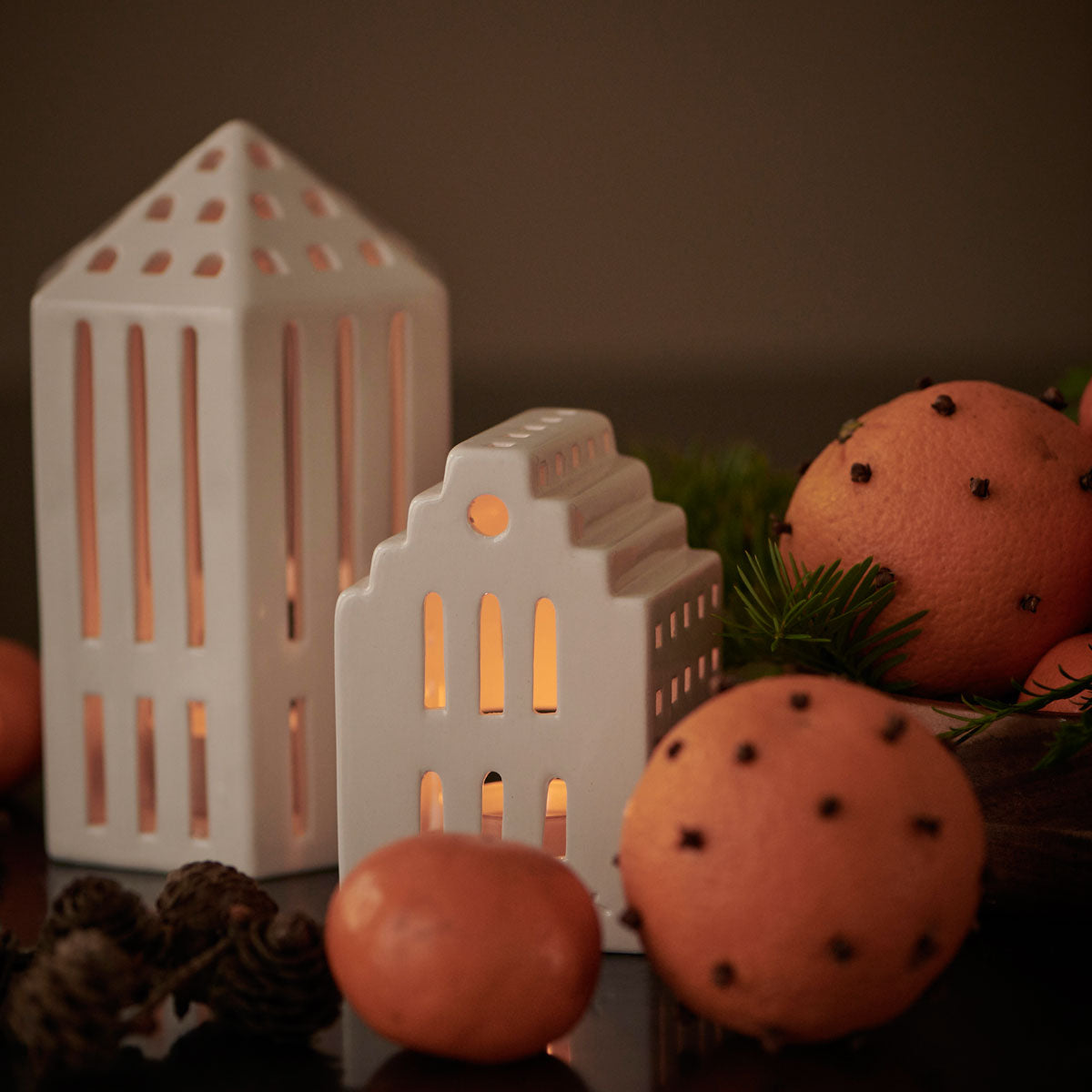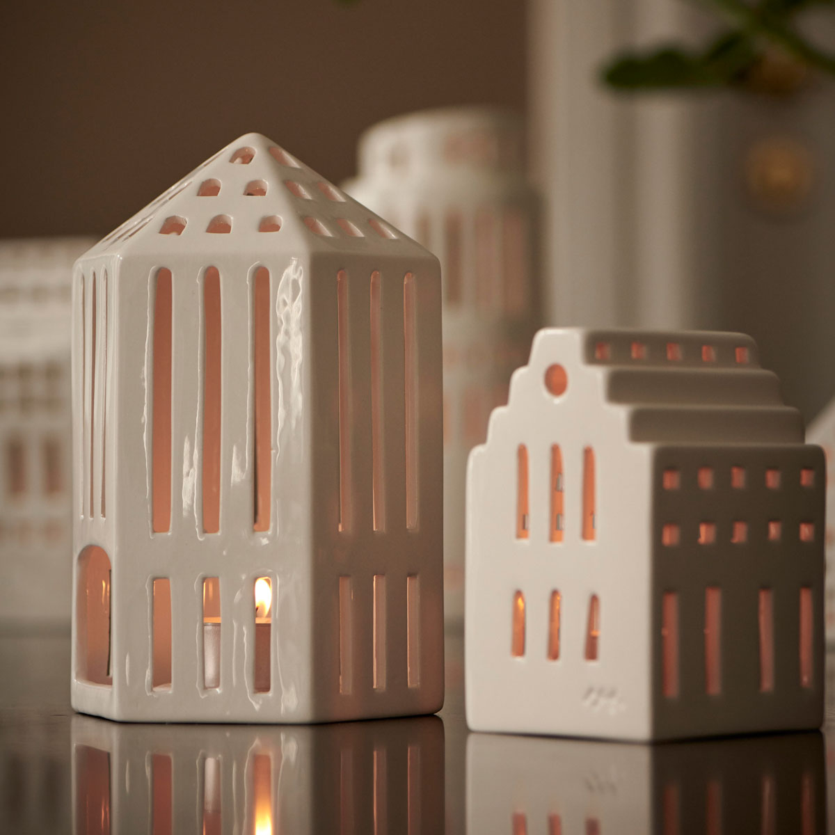 Die Lichthäuser Urbania von Kähler Design laden zum sammeln und Städte bauen auf moderne Art ein. Sie zeichnen sich durch ihr ganz besonderes Design aus und sind allesamt Unikate. In echter Handwerkskunst werden alle Fenster per Hand ausgeschnitten, was jedes Stück einzigartig macht. Mette Bache und Barbara Bendix Becker entwerfen für das dänische Traditionsunternehmen Kähler schmucke Häuser, Türme und Kirchen in unterschiedlichen Größen und Formen. Aber eins haben alle gemein - sie sind aus weisser Keramik und mit einem Teelicht beleuchtet wirken sie je nach Betrachtungswinkel immer anders. Die verschiedenen Lichthäuser sind einem bestimmtem Typus der modernen Architektur nachempfunden. Und wenn die Basilika sich zum Turm und das Atelier zur Galerie gesellt entsteht ein hübsches kleines beleuchtetes Städtchen. Die Lichthäuser verschönern nicht nur in der dunklen Jahreszeit ihre Fensterbank.