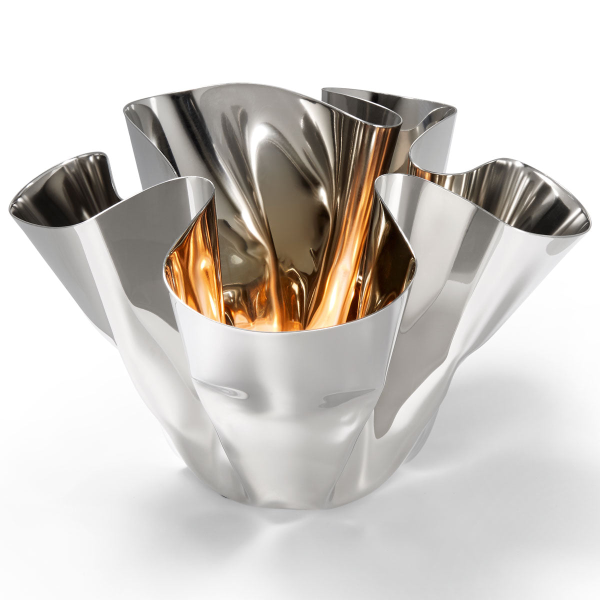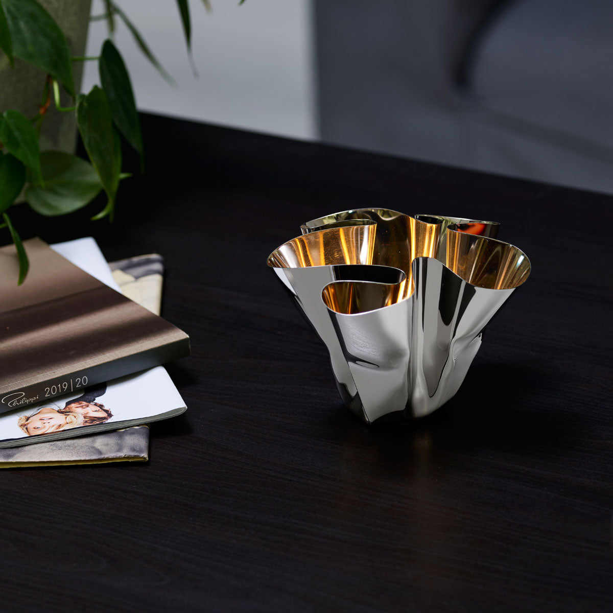 Das kleine Geschwisterchen der beliebten Margeaux Vase aus dem Hause Philippi ist endlich hier. Wie schon sein großes Vorbild besticht auch die kleinere Version durch schwungvolle, von Hand gelegte Falten. Mühelos zieht das formschöne Wohnaccessoire aus hochglanzpoliertem Edelstahl alle Blicke auf sich. Konzipiert als Windlicht lässt sich die kleine Margeaux sowohl als solches oder auch als Vase verwenden. Als moderne Tischlaterne fängt sie das Flackern des Kerzenscheins auf besonders magische Weise ein und sorgt so stets für aufregende Lichtspiele. Romantische Atmosphäre inklusive. Als Blumenvase steht das silberne Gefäß in wunderbar interessantem Kontrast zu farbenfrohen Blüten. Ob als Vase oder Laterne, dank der kompakten Größe von Ø 17 cm x H 12 cm findet das Philippi Windlicht Margeaux überall einen geeigneten Platz. Platzieren Sie Margeaux auf dem Sideboard im Flur, auf dem Couchtisch im Wohnzimmer oder auf dem Esstisch.