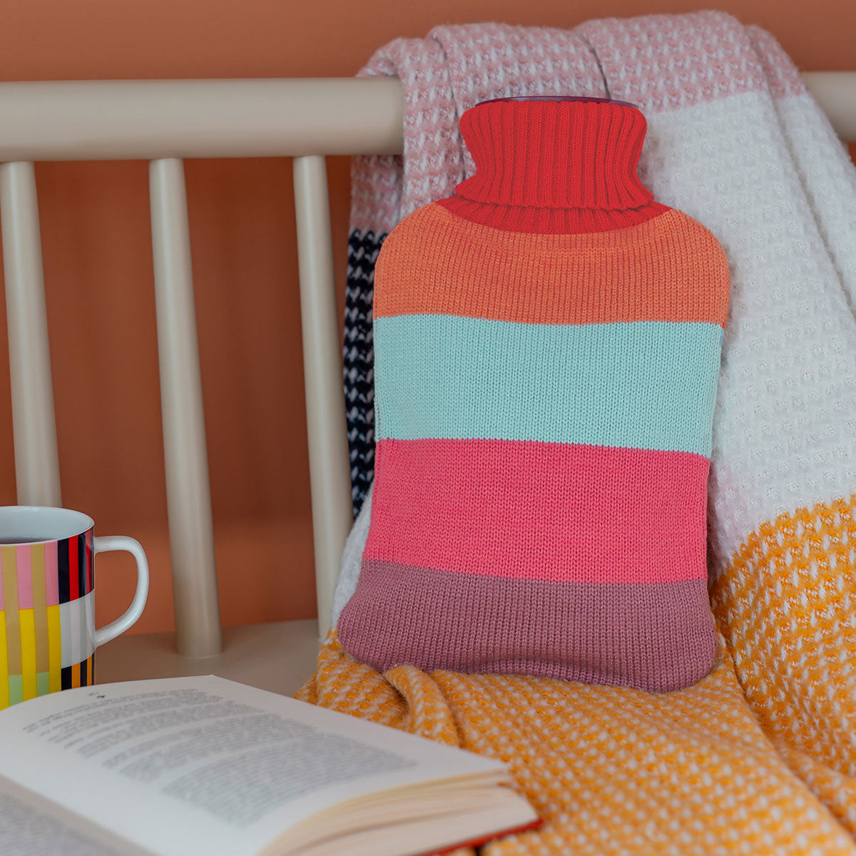 Wenn es draußen knackig kalt ist, ist eine Wärmflasche auf dem Sofa oder dem Bett so richtig gemütlich. Die Wärmflasche Lilli von Remember hat einen weichen, abnehmbaren Strickbezug mit farbenfrohen Streifen und sorgt so auch optisch für jede Menge Wohlbefinden. Sie kommt in den Maßen 19 x 6 x 32 cm (B x T x H) und hat ein Fassungsvermögen von ca. 2 Litern. Waschbar bei bis zu 30°C.