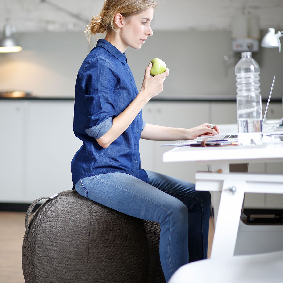 • Der angesetzte Tragegriff ist nicht nur sehr praktisch, denn man kann sich daran beim Hinsetzen oder Aufstehen festhalten, er macht auch den Transport des Design Sitzballes mit nur einer Hand möglich. So bleibt die andere Hand frei für das Tablet oder ein Notebook.