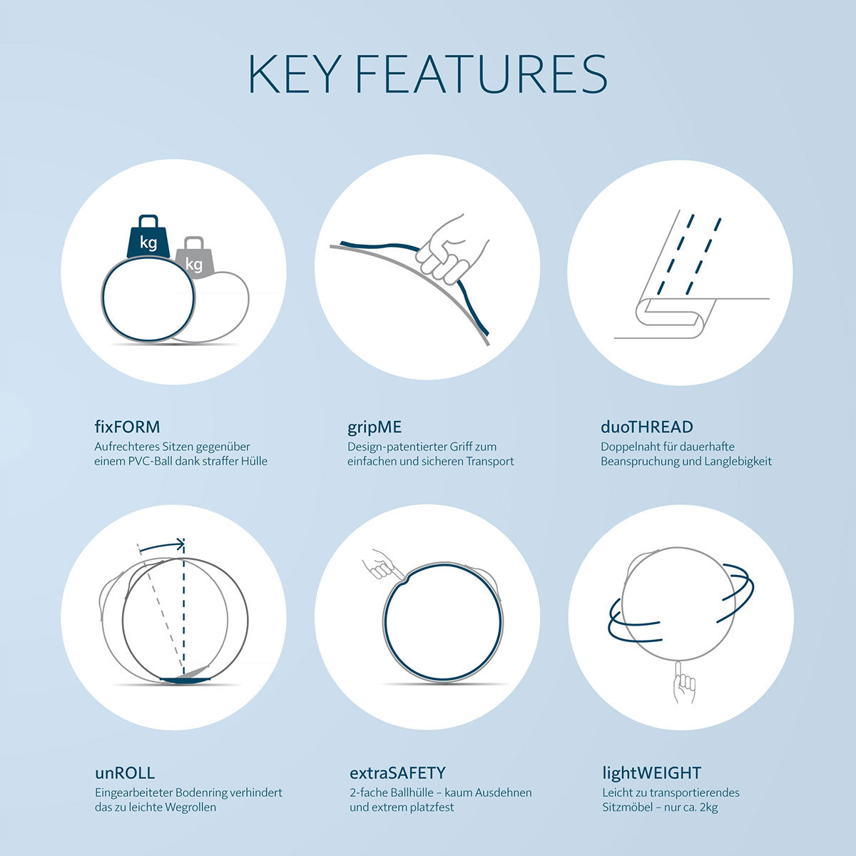 • Die  Interessengemeinschaft der Rückenschul-Lehrer/Innen e.V., Nürnberg hat den Design Sitzball als „Ergonomisches Produkt“ zertifiziert. Der robuste Möbelbezugsstoff ist warm, weich und waschbar.