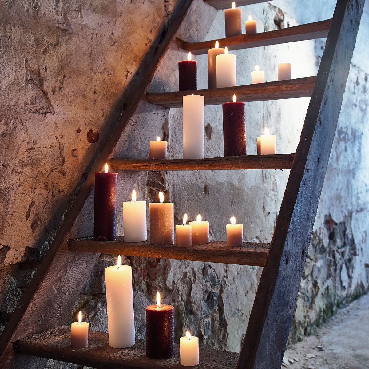 Weiße Stumpenkerze aus Stearin. Sie haben einen Durchmesser von 6 cm und sind 9 oder 14 cm hoch. Die Brenndauer liegt bei 23 beziehungsweise 42 Stunden, je nach Größe. Das verwendete Stearinwachs wird nicht wie herkömmliches Paraffinwachs aus Erdöl hergestellt, sondern aus 100% nachwachsenden Rohstoffen.