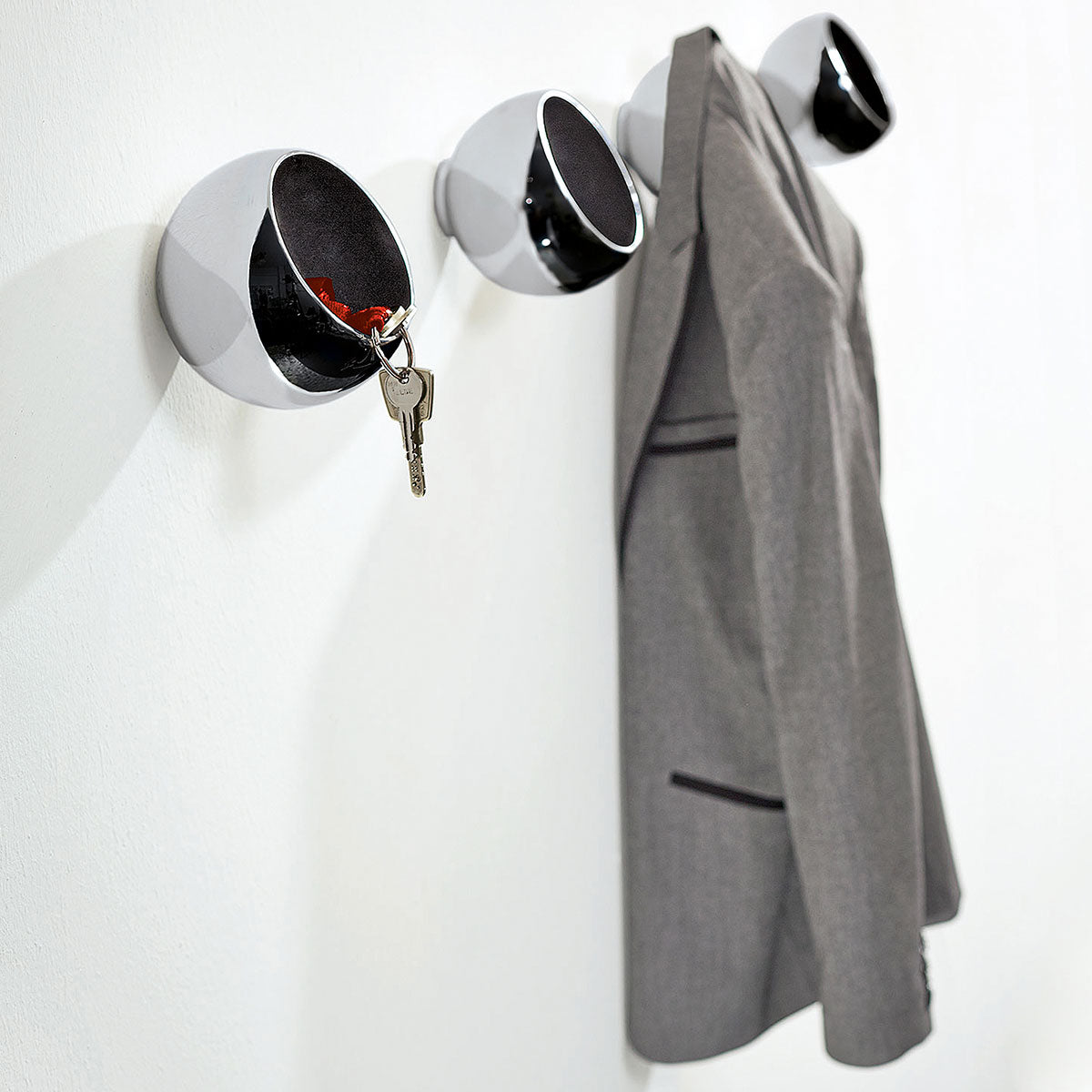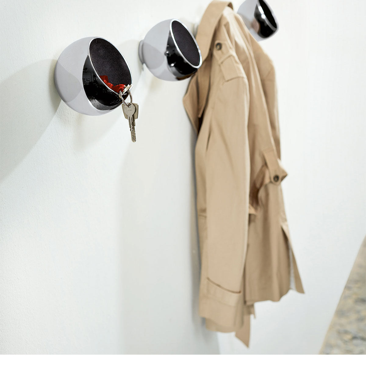 Garderobenkugel: Design trifft Funktionalität. Sie suchen schon lange eine Garderobe, die zweckmäßig ist und dabei nicht langweilig? Dann ist die Garderobenkugel Sphere von Philippi genau richtig. Als Solitär oder in der Gruppe - die Kugel mit doppeltem Nutzen garantiert bewundernde Blicke im Eingangsbereich. Geldbörse, Schlüssel, Kopfhörer, Handschuhe... finden in dem mit Samt ausgekleidetem Ablagefach seinen Platz. Die größeren Sachen wie Mantel, Jacke, Schal, Tasche oder Hundeleine hängen Sie einfach darüber. Die sanfte Rundung hinterlässt keine Ausbeulung an der Kleidung.
