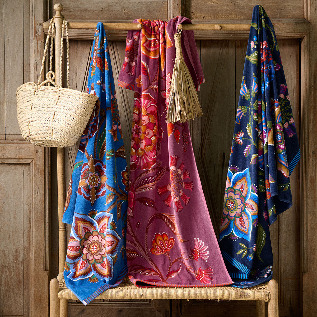 Für einen gelungenen Strandtag darf so manch ein Beach Accessoire nicht fehlen: ein Bikini bzw. eine Badehose, eine Sonnenbrille, um dem sommerlichen Look einen letzten Schliff zu verpassen und ein gutes Buch zum Zeitvertreib. Aber auch ein Strandtuch darf natürlich keinesfalls fehlen. Am besten hochwertig verarbeitet und stilvoll designt. Hierfür stellen wir Ihnen das Badetuch Viva la Vida von PIP STUDIO vor. Aus 100 % Baumwolle in der Qualität 400 g/m2 überzeugt Viva la Vida durch eine weiche und anschmiegsame Velours Oberseite mit besonderem Liegekomfort. Zu letzterem trägt auch die großzügige Größe von 100 x 180 cm bei. Die Unterseite besteht aus saugfähigem Frottee, welches für ein stets schnelles Trocknen sorgt. Optisch besticht Viva la Vida mit einem verspielten Muster aus Blumen, Blüten und Zweigen. Ein gestreifter Abschluss in Akzentfarbe verziert die schmale Ober- sowie Unterkante. Egal ob als Duschtuch, Saunatuch oder Strandlaken - Viva la Vida von Pip Studio wird garantiert bewundernde Blicke auf sich ziehen. Perfekt für alle Frauen und Mädchen, die die bunten Motive von Pip Studio lieben.