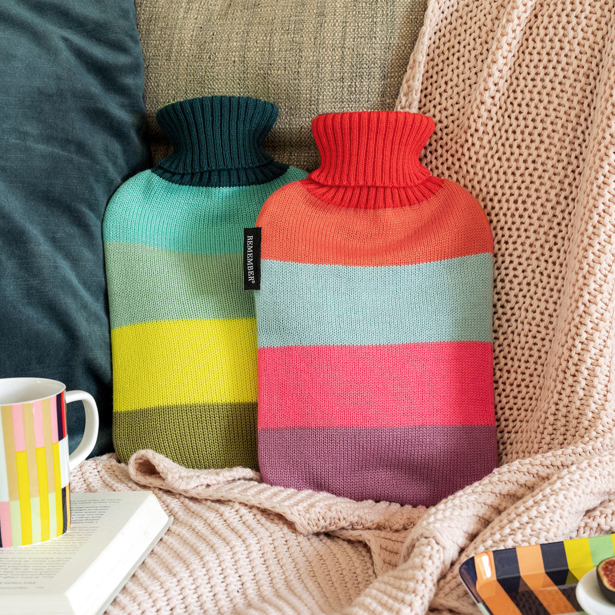 Wenn es draußen knackig kalt ist, ist eine Wärmflasche auf dem Sofa oder dem Bett so richtig gemütlich. Die Wärmflasche Pepe von Remember hat einen weichen, abnehmbaren Strickbezug mit farbenfrohen Streifen und sorgt so auch optisch für jede Menge Wohlbefinden. Sie kommt in den Maßen 19 x 6 x 32 cm (B x T x H) und hat ein Fassungsvermögen von ca. 2 Litern. Waschbar bei bis zu 30°C.