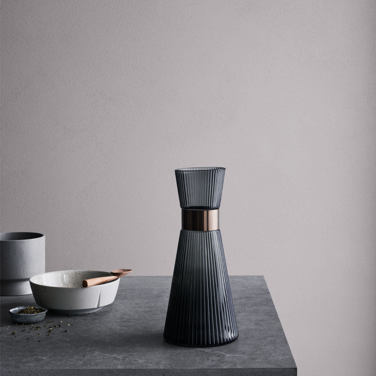 Freunde von funktionellem und schlichtem Design haben ihr Herz schon lange für die Grand Cru Serie von Rosendahl entdeckt. Designer Erik Bagger kreiert mit seinem Blick für Details und seinem besonderen Gefühl für das Zusammenwirken verschiedener Materialien schlichtes und dennoch stilvolles Tafelgeschirr. Jetzt hat Rosendahl die beliebte Serie um die Grand Cru Wasserkaraffe in Smoke erweitert. Servieren Sie eiskaltes Wasser, erfrischende Smoothies oder frisch gepresste Säfte in der modernen Glaskaraffe mit einem Fassungsvermögen von 1 Liter. Aus mundgeblasenem smoke grauem Glas ist die Karaffe zugleich leicht und elegant. Die Rillen-Struktur verleiht ihr eine moderne Optik und findet sich in anderen Produkten der Grand Cru Serie wieder. So kann durch weitere Tischaccessoires eine harmonische und klare Linie auf den Tisch gebracht werden. Außergewöhnlich ist auch die Kombination des Materials Glas mit der patinierten Manschette aus rostfreiem Stahl am Hals der Karaffe. Durch diese bekommt die Wasserkaraffe ein besonders edles Aussehen, das jede gedeckte Tafel im Handumdrehen aufwertet.