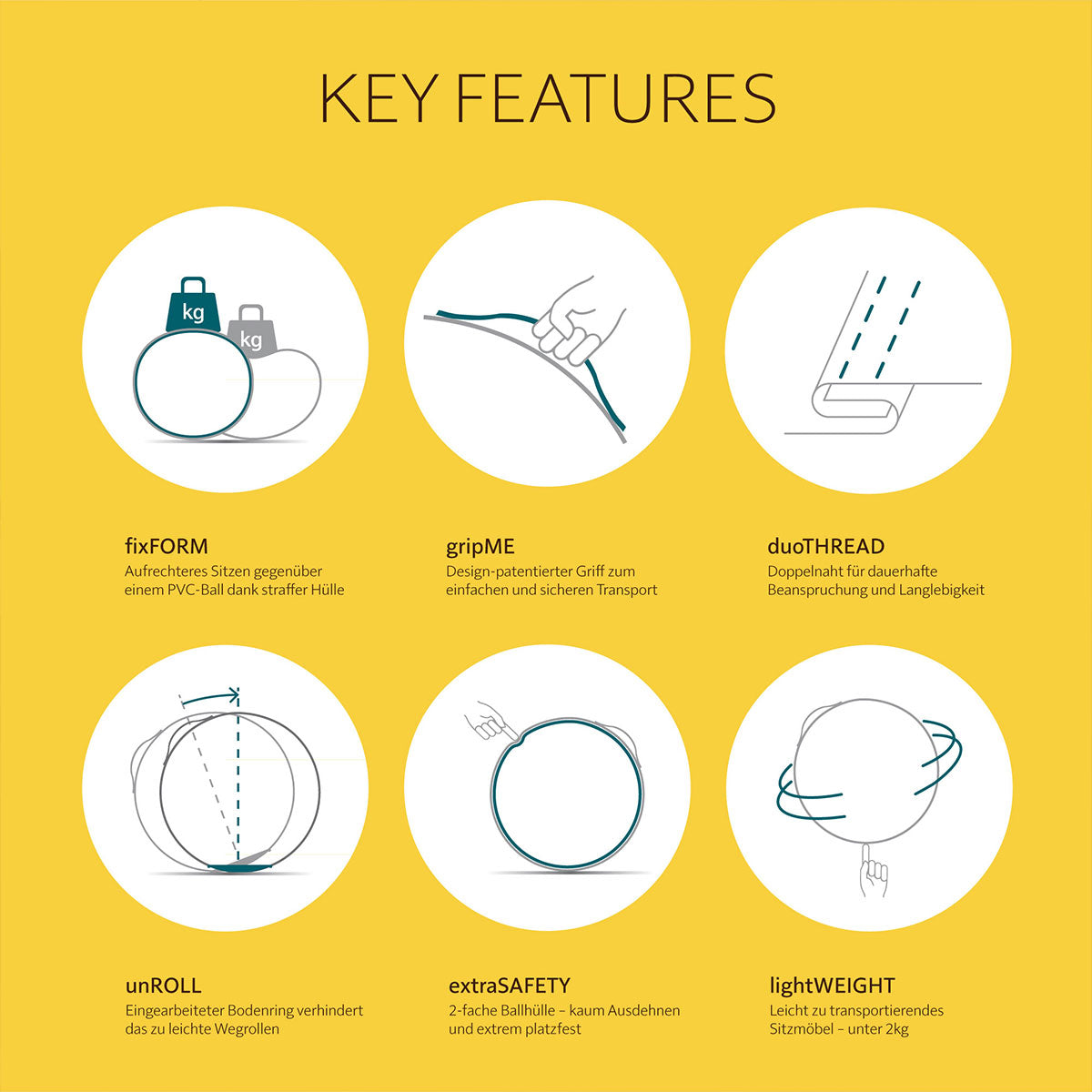 • Die  Interessengemeinschaft der Rückenschul-Lehrer/Innen e.V., Nürnberg hat den Design Sitzball als „Ergonomisches Produkt“ zertifiziert. Der robuste Stoff ist warm, weich und waschbar