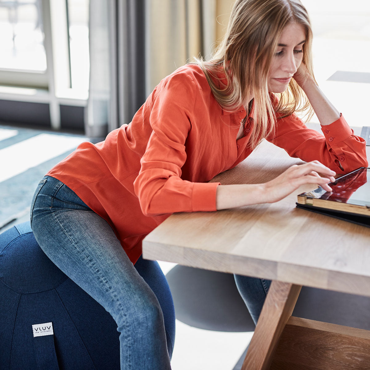 • Der angesetzte Tragegriff ist nicht nur sehr praktisch, denn man kann sich daran beim Hinsetzen oder Aufstehen festhalten, er macht auch den Transport des LEIV Sitzballs mit nur einer Hand möglich. So bleibt die andere Hand frei für das Tablet oder ein Notebook.