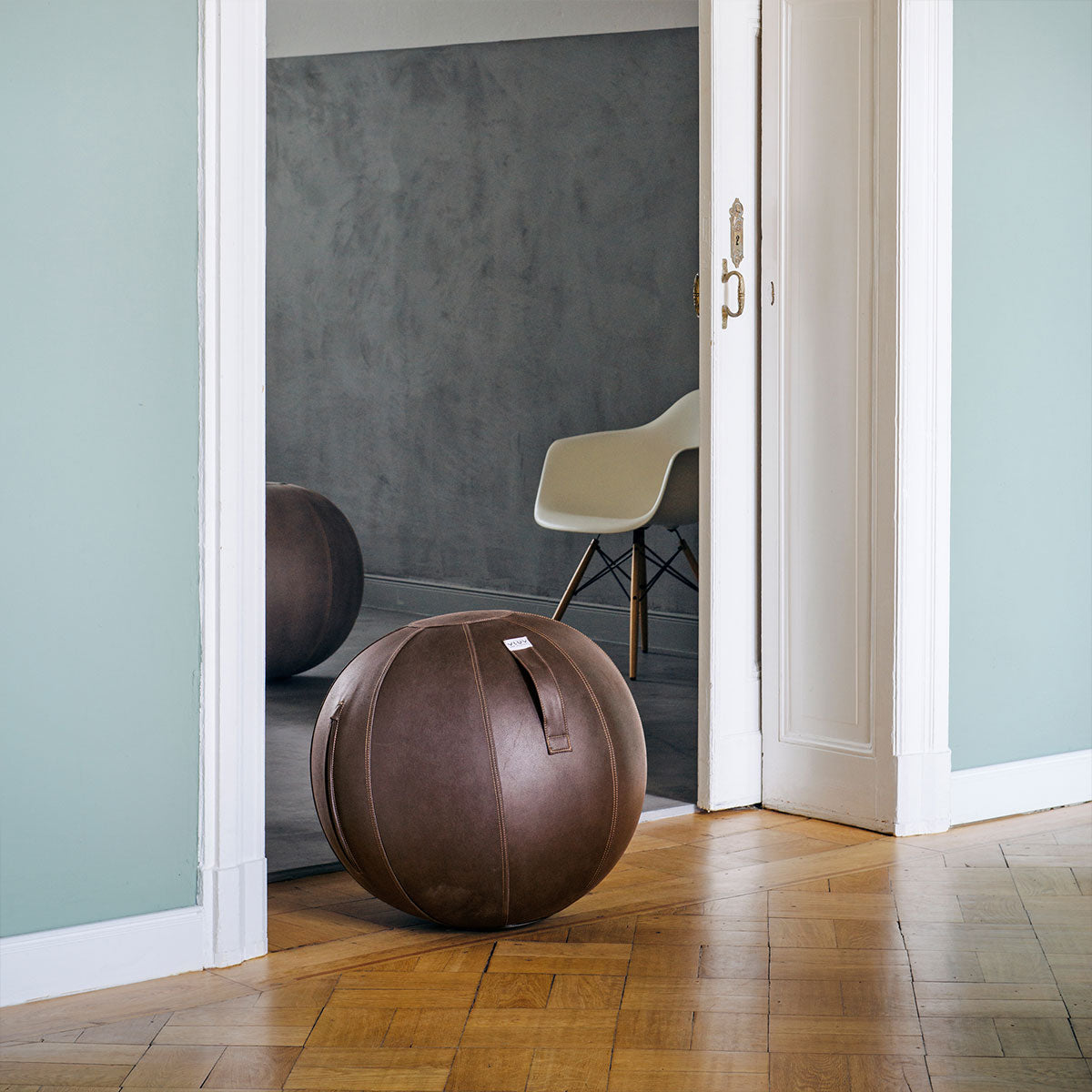 Sitzbälle oder Gymnastikbälle kennt man als knallbunte, klebrige PVC Bälle, die wohl die meisten von uns lieber verstecken, als offen in der Wohnung oder im Office liegen lassen würden. Schaffen Sie Bewegung am Arbeitsplatz mit dem Lederimitat Sitzball VEEL von VLUV. Der Sitzball hat einen angenehmen Bezug, der sich auch optisch perfekt in geschmackvoll eingerichtete Büros und Wohnzimmer integrieren lässt. Durch den weichen, warmen und dennoch strapazierfähigen Lederstoffbezug ist ein gesundes und stilvolles Sitz-, Sport- und Spielmöbel entstanden. Der Design Sitzball ist in zwei Größen lieferbar, so wird optimal zur Kräftigung der Rückenmuskulatur und zu einem gesundem Sitzen beigetragen. Man kann ihn auch für viele sportliche Übungen einsetzen, z.B. bei der Gymnastik, dem funktionalen Training, bei Yoga oder Pilates. Oder, man kann auch einfach nur mit dem Design Sitzball Herumtollen und ihn dann als Eyecatcher im Raum liegen lassen.