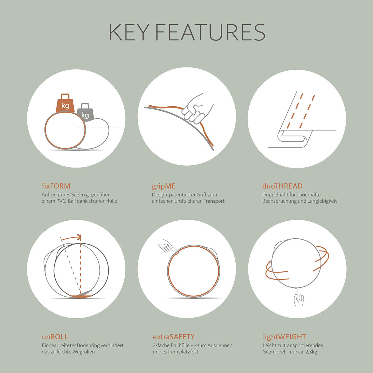 • Die  Interessengemeinschaft der Rückenschul-Lehrer/Innen e.V., Nürnberg hat den Design Sitzball als „Ergonomisches Produkt“ zertifiziert. Der robuste Möbelbezugsstoff ist warm, weich und waschbar.