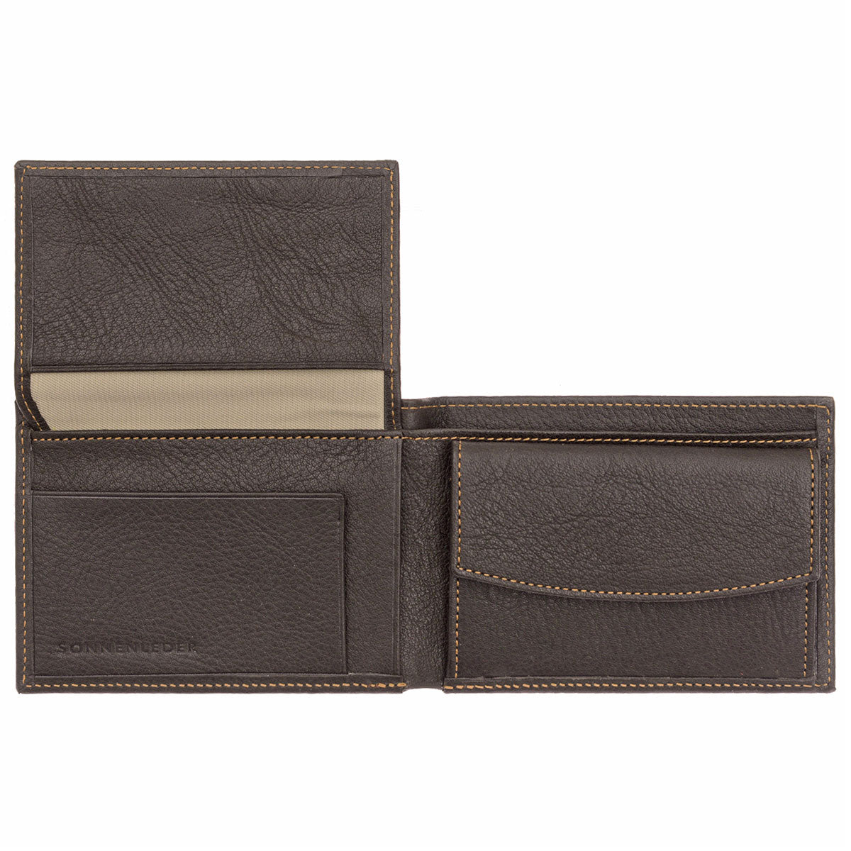 Minigeldbörse Nahe mocca. Schluss mit losen Karten, Belegen, Scheinen und Münzen in den verschiedenen Taschen Ihrer Hose oder Jacke. Die Geldbörse NAHE ist ideal für die Hosentasche. Kompakt und handlich mit einem Geldscheinfach für gefaltete Scheine, einem kleinen Münzfach sowie drei Kreditkartenfächern und einem Zettelfach ausgestattet findet das Wichtigste seinen Platz und das ewige Suchen und Klimpern in den Taschen hat ein Ende. Die Geldbörse der Manufaktur Sonnenleder ist von Hand gefertigte und pflanzlich gegerbte. Echtes Sonnenleder erkennen Sie an der Griffigkeit, der besonderen Farb- und Oberflächenstrukturen und am wohlriechenden Duft. Da das Leder seine natürliche Eigenschaften bewahrt hat, bedarf es nur wenig Pflege. Nachfetten oder andere Nachbehandlungen sind nicht nötig und können eher schaden.