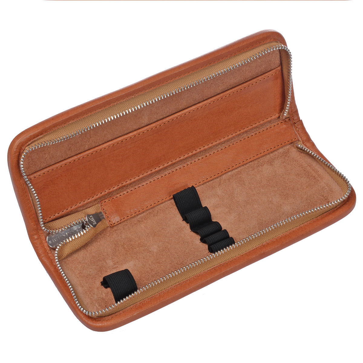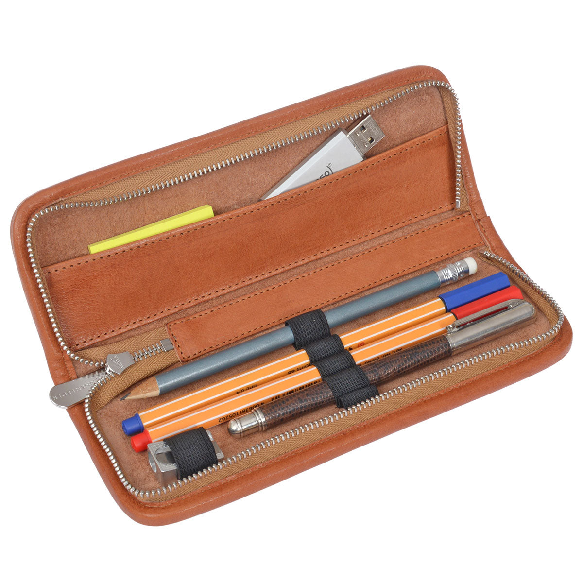 Das Schreibetui Kluge der Manufaktur Sonnenleder bietet Platz für insgesamt 5 Stifte (bis 17 cm Länge). Das Innenfutter besteht aus ungefärbtem, rauem Spaltleder. Fünf Gummischlaufen, darunter eine größere, z. B. für Füllhalter, sorgen für einen guten Halt der Stifte. In einer weiteren kleinen Schlaufe kann ein Radierer, Anspitzer oder ein USB-Stick untergebracht werden. Ein Lederfach bietet Platz für flache Sachen wie Briefmarken, Visitenkarten, Post it, kleines Lineal... Geschlossen wird das Schreibetui Kluge mit einem matt vernickeltem Messing Qualitätsreißverschluss.