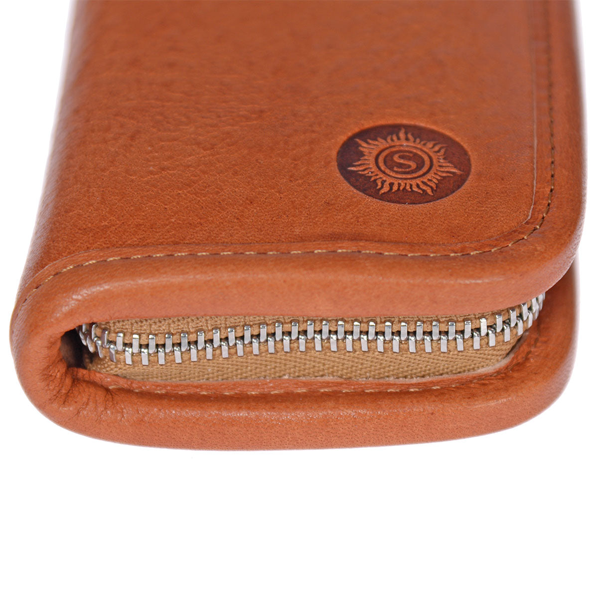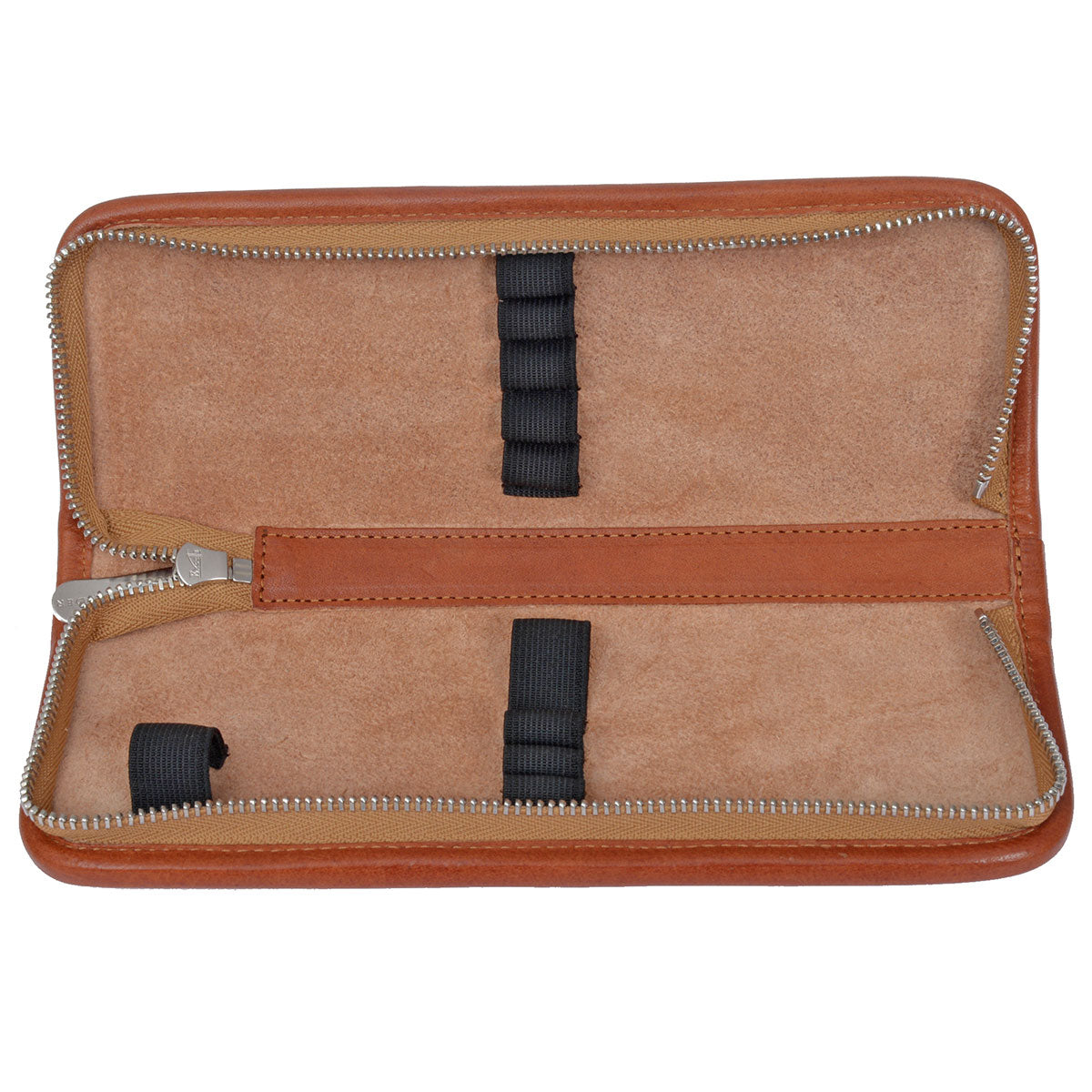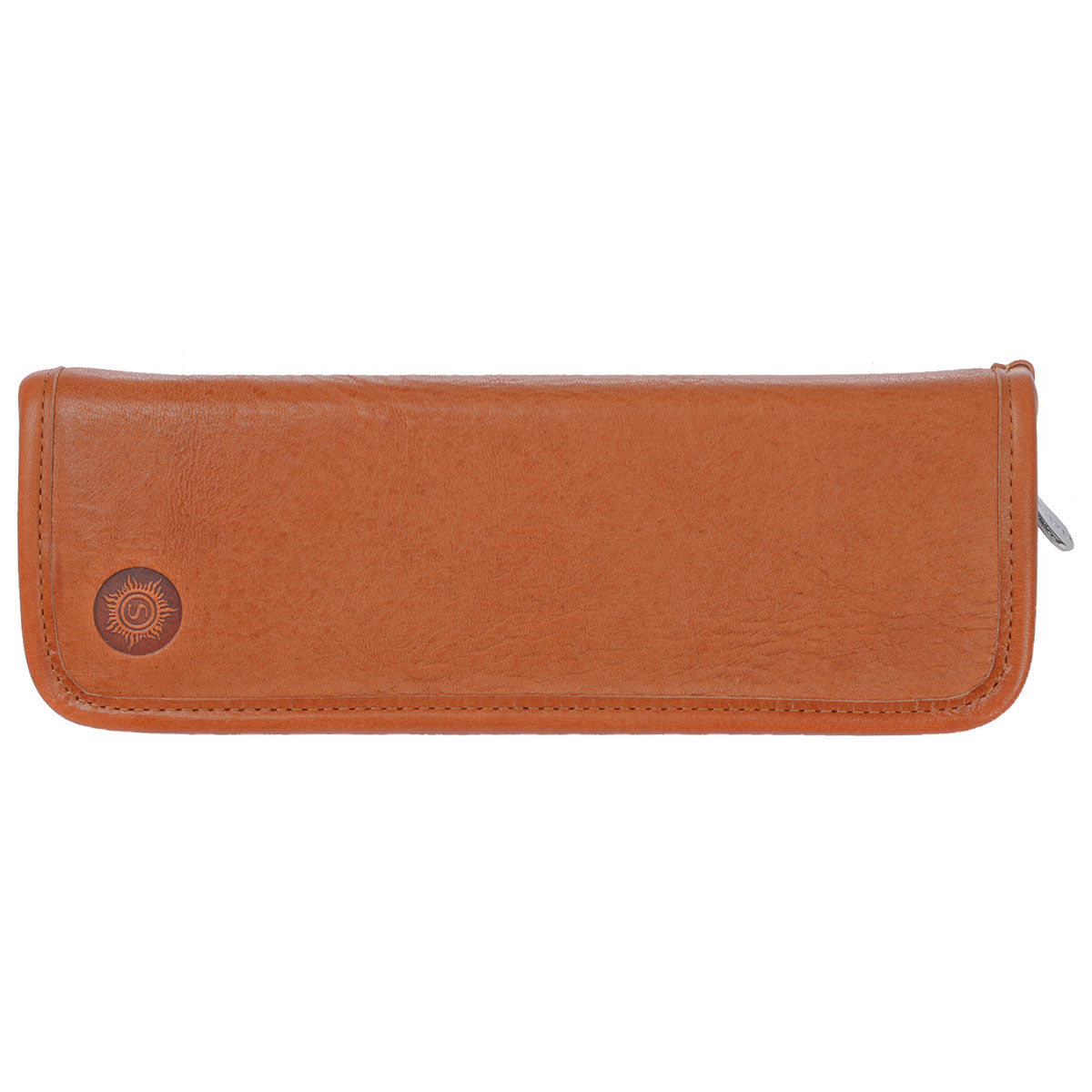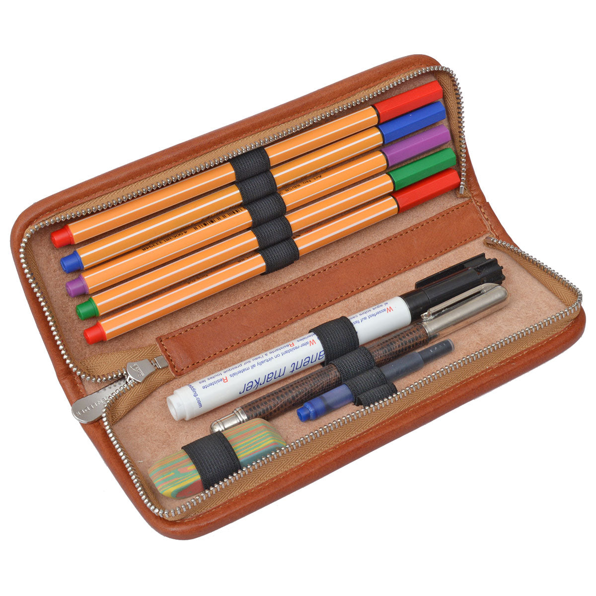 Das Schreibetui Lenz der Manufaktur Sonnenleder bietet Platz für insgesamt 9 Schreibgeräte (bis 17 cm Länge). Das Innenfutter besteht aus ungefärbtem, rauem Spaltleder. Neun Gummischlaufen, darunter eine größere, z. B. für Füllhalter, sorgen für einen guten Halt der Stifte. In einer weiteren kleinen Schlaufe kann ein Radierer, Anspitzer oder ein USB-Stick untergebracht werden. Geschlossen wird das Schreibetui Lenz mit einem matt vernickeltem Messing Qualitätsreißverschluss.
