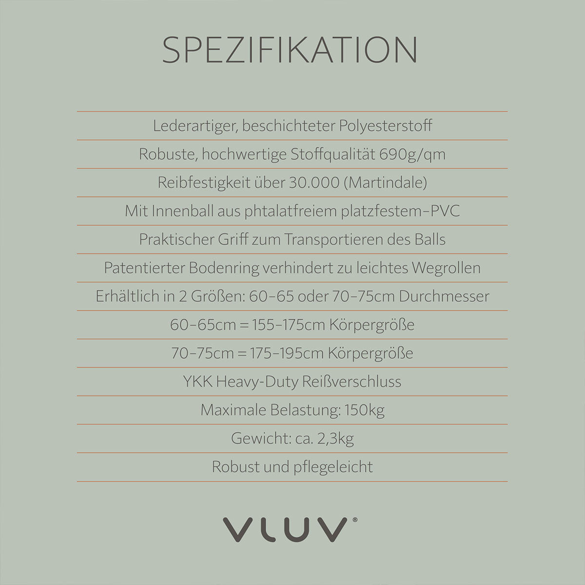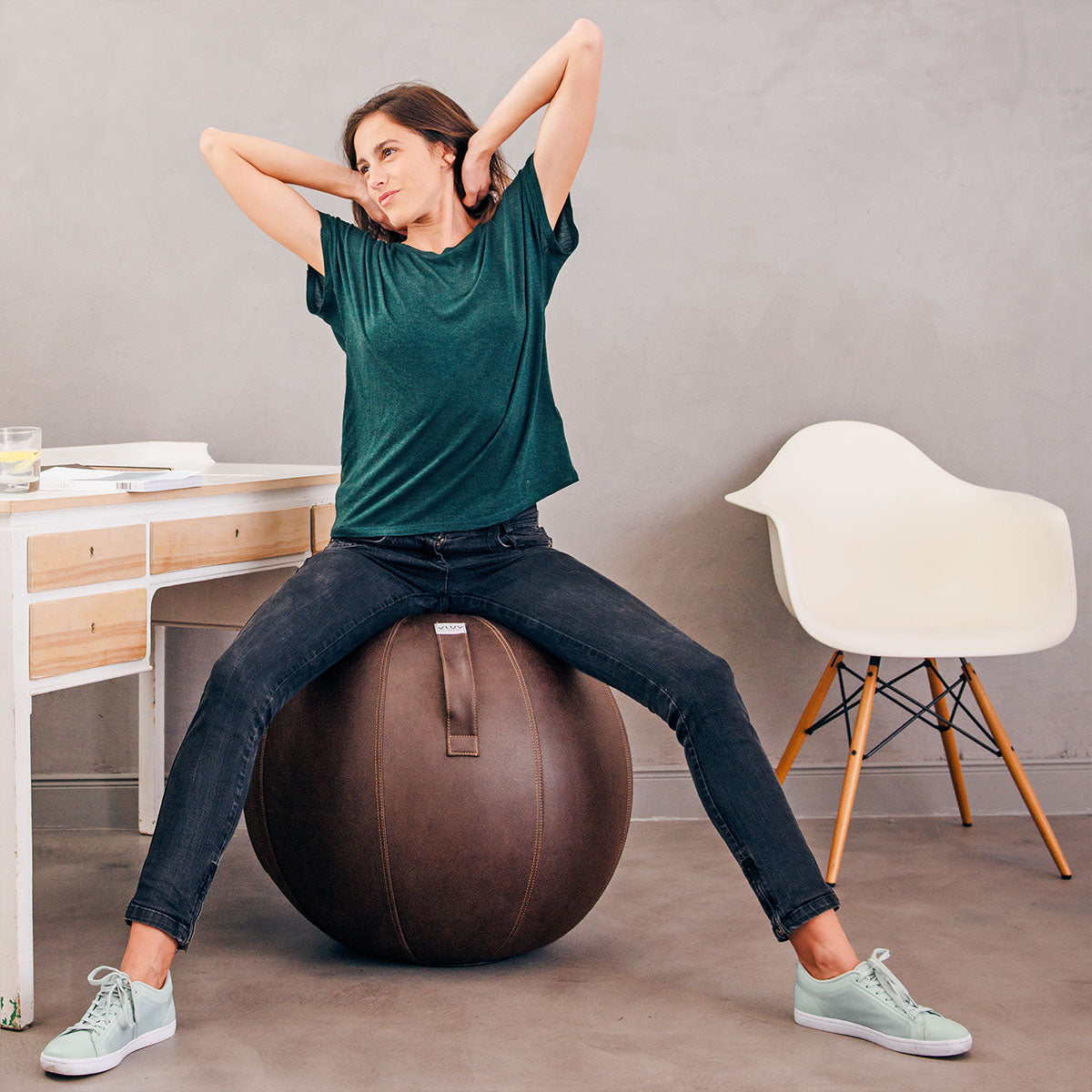 Sitzbälle oder Gymnastikbälle kennt man als knallbunte, klebrige PVC Bälle, die wohl die meisten von uns lieber verstecken, als offen in der Wohnung oder im Office liegen lassen würden. Schaffen Sie Bewegung am Arbeitsplatz mit dem Lederimitat Sitzball VEEL von VLUV. Der Sitzball hat einen angenehmen Bezug, der sich auch optisch perfekt in geschmackvoll eingerichtete Büros und Wohnzimmer integrieren lässt. Durch den weichen, warmen und dennoch strapazierfähigen Lederstoffbezug ist ein gesundes und stilvolles Sitz-, Sport- und Spielmöbel entstanden. Der Design Sitzball ist in zwei Größen lieferbar, so wird optimal zur Kräftigung der Rückenmuskulatur und zu einem gesundem Sitzen beigetragen. Man kann ihn auch für viele sportliche Übungen einsetzen, z.B. bei der Gymnastik, dem funktionalen Training, bei Yoga oder Pilates. Oder, man kann auch einfach nur mit dem Design Sitzball Herumtollen und ihn dann als Eyecatcher im Raum liegen lassen.