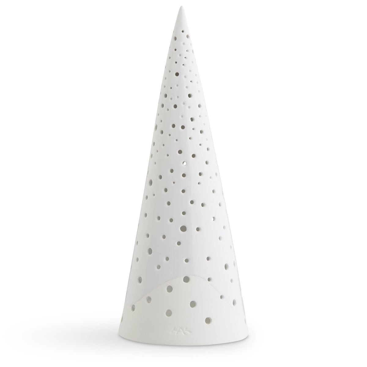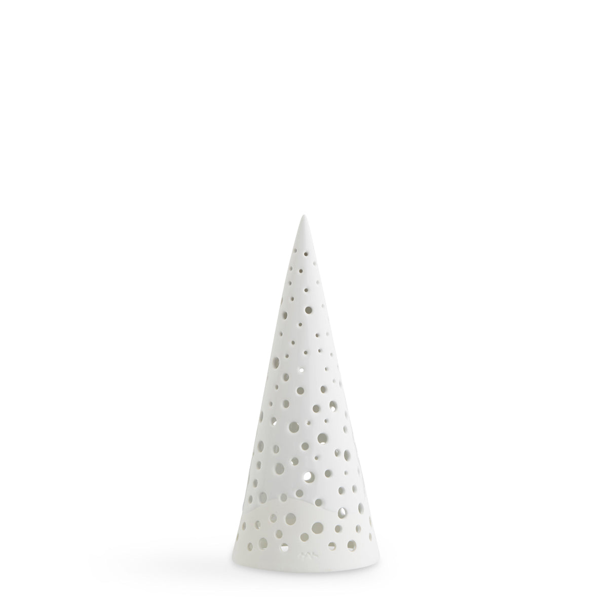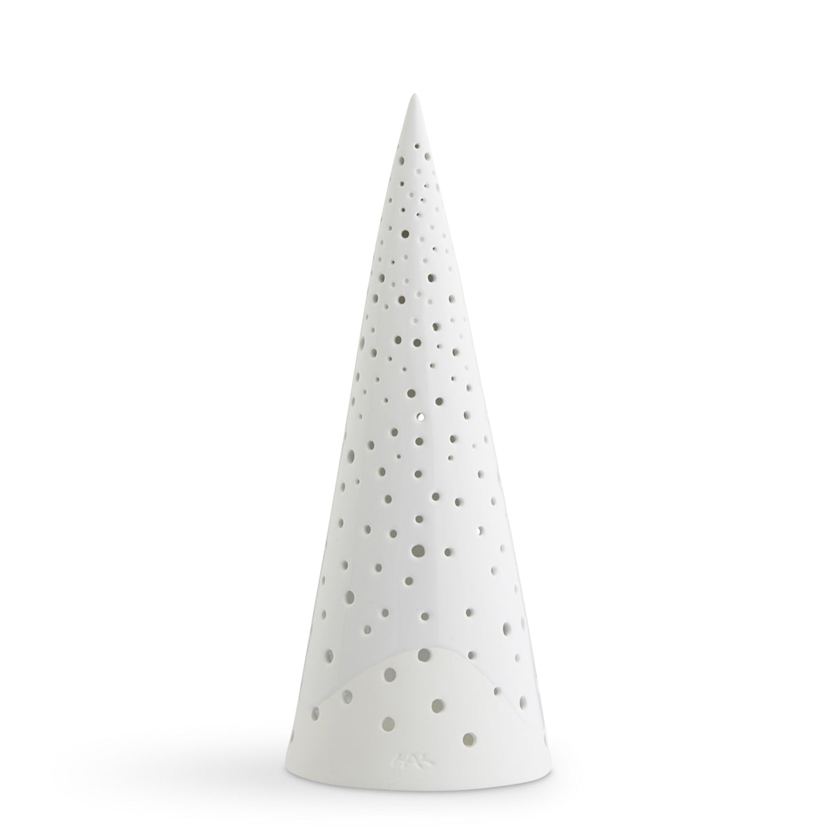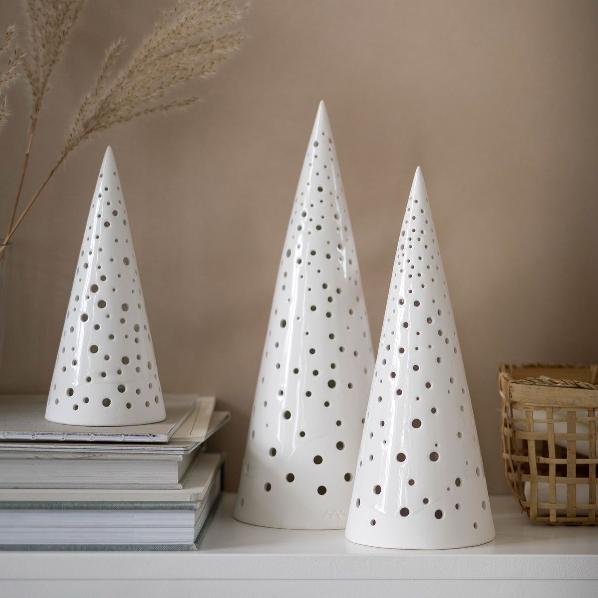 Die Nobili Teelichthalter aus Keramik in Kegelform erinnern an verschneite Tannenbäume. Klare Formen und eine raffinierte Glasur lassen Nobili zu einem besonderen Dekoacceories werden. Die seidig schimmernde Glasur im oberen Bereich wirkt wie zufällig wellenförmig abgesetzt. Im unteren Bereich ist der Kegel unglasierte. So erinnert der Nobili Kegel an eine mit Schnee bedeckte Tanne und wird zur gemütlichen Winterdeko. Die Kähler Keramikkegel lassen sich mit einem Teelicht erleuchten. Sobald die Kerze angezündet ist, leuchten die kleinen von Hand ausgeschnittenen Lochpünktchen und erinnern an einen Weihnachtsbaum mit Kerzen auf den Zweigen.