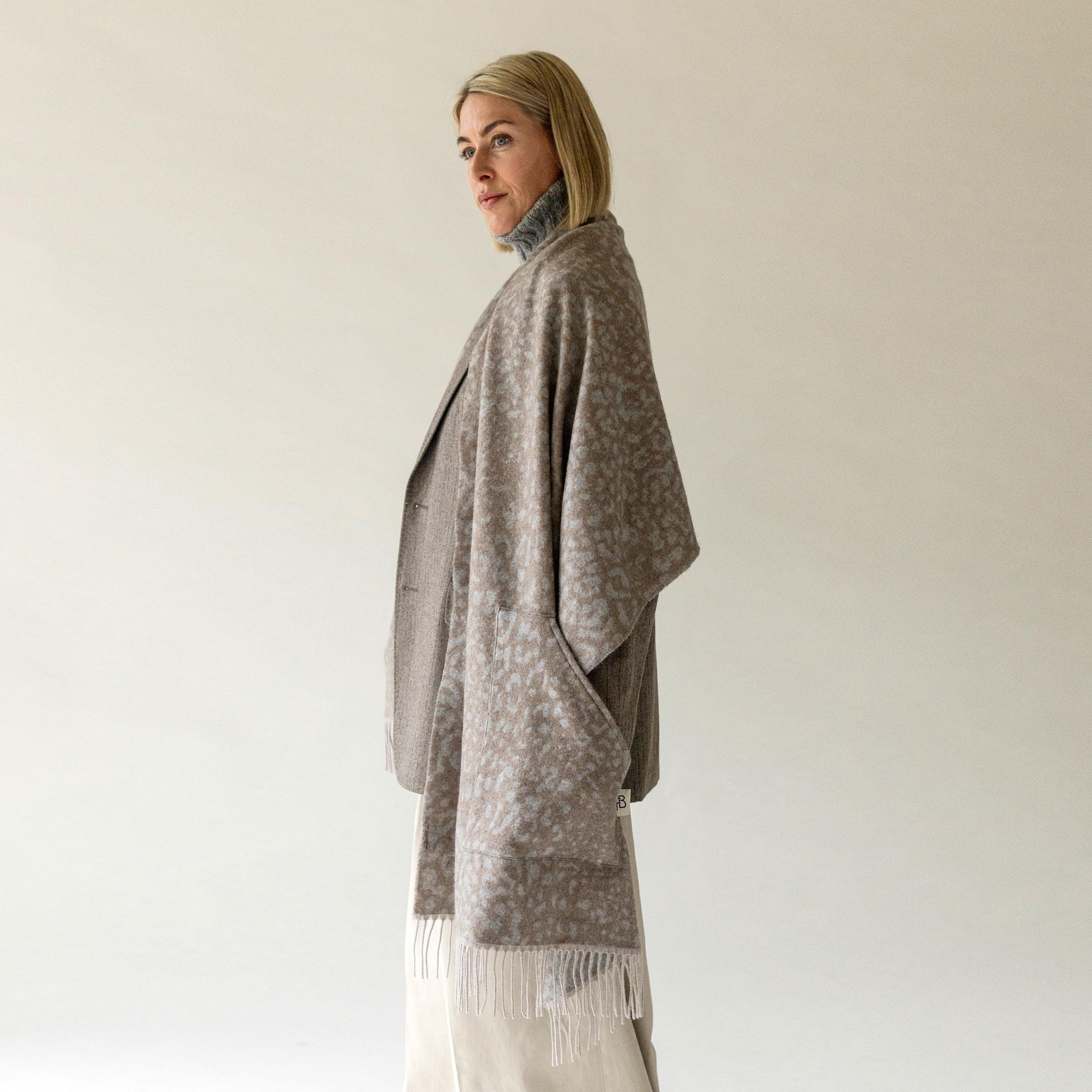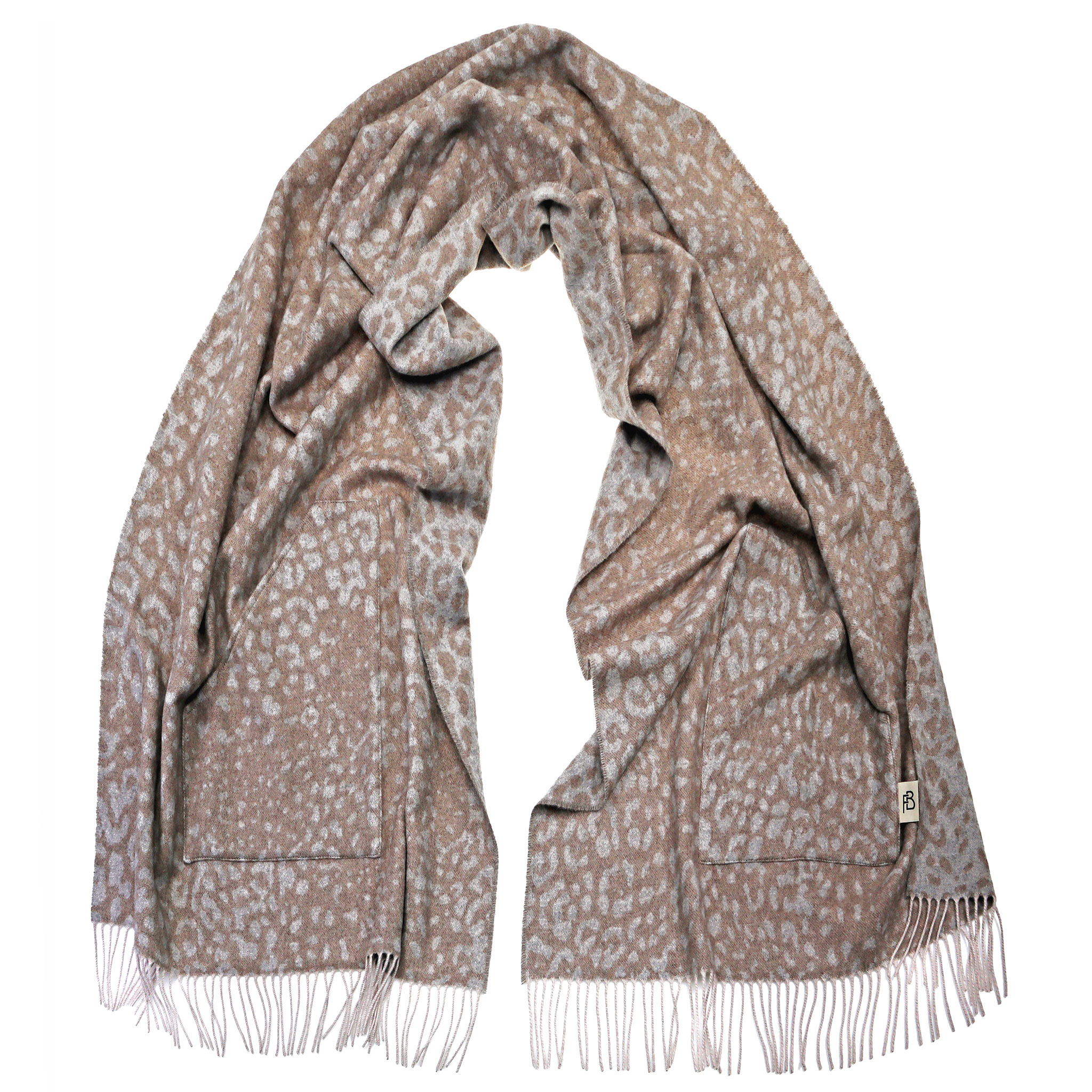 Die SAHARA Stola braun / hellgrau mit Taschen der renommierten deutschen Manufaktur Franz Barth aus Bayern verbindet auf elegante Weise Stil und Funktionalität. Dieses großzügige Doubleface-Accessoire ist mit 65 x 195 cm weit mehr als eine weiche Stola: Neben den hochwertigen Materialeigenschaften bietet es zwei praktische Taschen, ideal zum Wärmen der Hände oder zur sicheren Aufbewahrung von Mobiltelefonen, Taschentüchern oder Schlüssel. Das klassische Leomuster ist in einer zweifarbigen Doubleface-Version in eleganten Ton-in-Ton-Schattierungen gefertigt. Die Mischung aus 60 % Kaschmir und 40 % Schurwolle verleiht ein besonders sanftes und anschmiegsames Tragegefühl.
