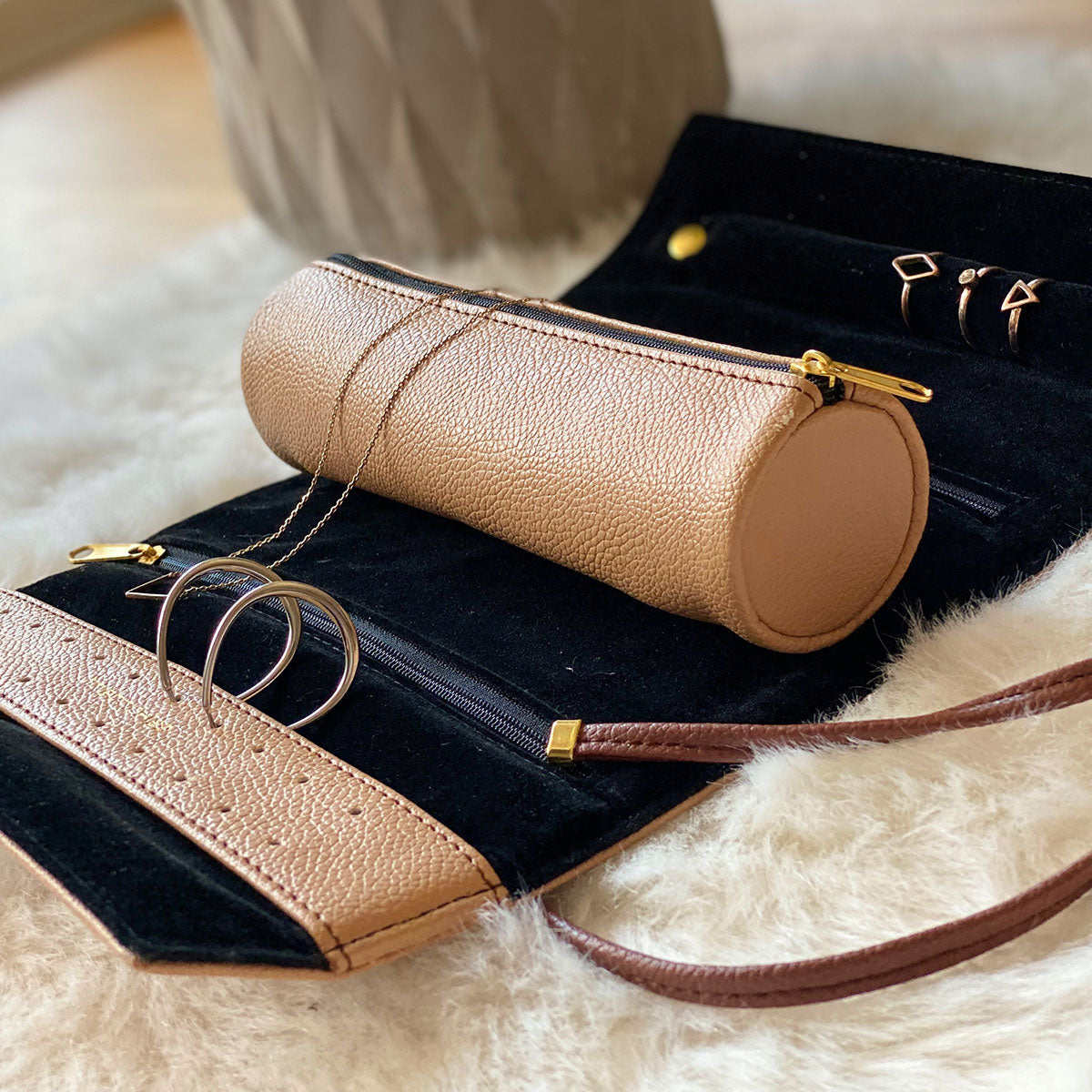 Die Schmuckrolle Ascot von Friedrich23 bietet den optimalen Schutz für alle Ihre Wertsachen und Schmuckstücke. Aus hochwertigem Kunstleder gefertigt ist sie eine modische wie praktische Alternative zur klassischen Schmuckaufbewahrung wie in etwa dem Schmuckkoffer. Vom Aufbau her vergleichbar mit Ascot einer Kulturrolle – eine flache Tasche, die sich zusammenrollen und verschließen lässt. Im Inneren der Schmuckrolle befinden sich zwei Reißverschlussfächer, ein herausnehmbares Reißverschluss-Täschchen, eine Haltevorrichtung für Ringe und eine Ohrringleiste mit Platz für bis zu zehn Paar Ohrringe. Verschlossen wird sie mit einem Schnürband in Akzentfarbe und hat anschließend eine Größe von ca. 20 x 7 cm. Aufgrund ihrer kompakten Größe und übersichtlichen Aufteilung macht sich die Schmuckrolle Ascot auch wunderbar als Begleiter auf Reisen und im Urlaub.