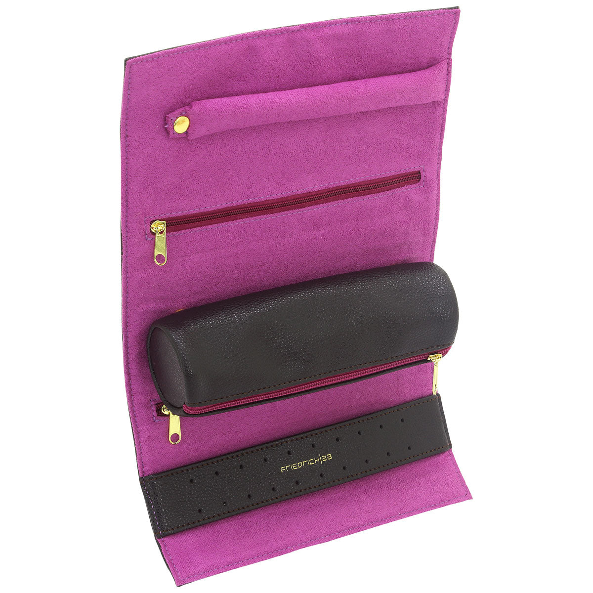 Die Schmuckrolle Ascot von Friedrich23 bietet den optimalen Schutz für alle Ihre Wertsachen und Schmuckstücke. Aus hochwertigem Kunstleder gefertigt ist sie eine modische wie praktische Alternative zur klassischeren Schmuckaufbewahrung wie in etwa dem Schmuckkoffer. Vom Aufbau her ähnelt Ascot einer Kulturrolle - eine flache Tasche, die sich zusammenrollen und verschließen lässt. Im Inneren der Schmuckrolle befinden sich zwei Reißverschlussfächer, ein herausnehmbares Reißverschluss-Täschchen, eine Haltevorrichtung für Ringe und eine Ohrringleiste mit Platz für bis zu zehn Paar Ohrringe. Verschlossen wird sie mit einem Schnürband in Akzentfarbe und hat anschließend eine Größe von ca. 20 x 7 cm. Aufgrund ihrer kompakten Größe und übersichtlichen Aufteilung macht sich die Schmuckrolle Ascot auch wunderbar als Begleiter auf Reisen und im Urlaub.