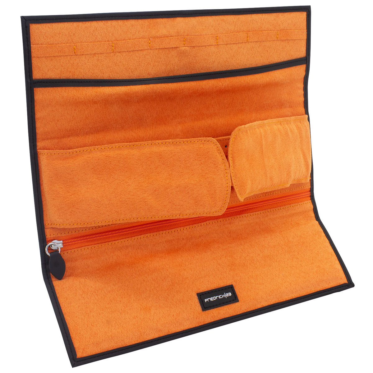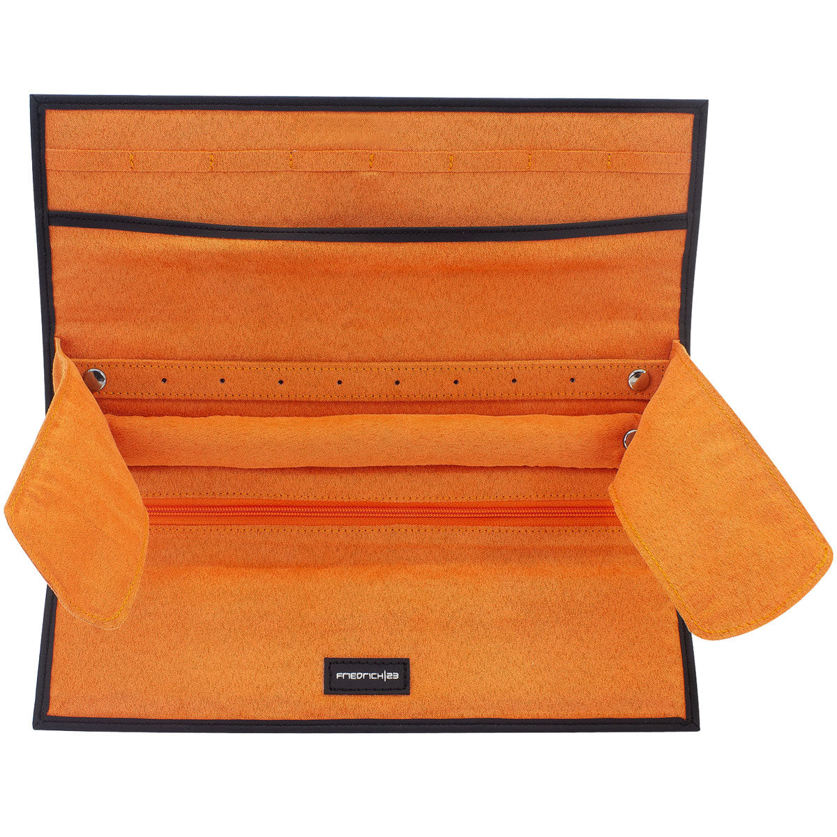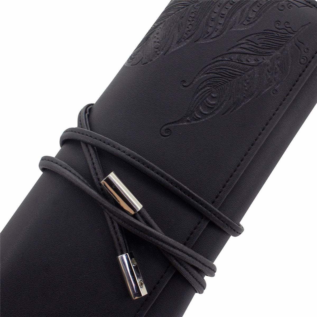 Die Schmuckrolle Boho von Friedrich23 bietet den optimalen Schutz für alle Ihre Wertsachen und Schmuckstücke. Mit einer kompakten Größe von 27 x 9,5 x 4 cm ist sie eine praktische Alternative zum klassischen Schmuckkoffer und überzeugt dadurch vor allem auf Reisen und im Urlaub. Vom Aufbau her ähnelt die Schmuckrolle einer Kulturrolle – eine flache Tasche, die sich zusammenrollen und verschließen lässt. Neben einem großen Hauptfach bietet sie ein zusätzliches Reißverschlussfach und eine herausnehmbare Ohrringleiste mit Platz für bis zu vier Paar Ohrringe sowie eine Ringrolle mit einem Durchmesser von etwa 20 mm. Fixiert werden die beweglichen Leisten mit Druckknöpfen. Eine Schutzabdeckung links und rechts schützt Ringe und Ohrringe vor unschönen Kratzern. Verschlossen wird Boho mit einem Kordelverschluss mit Metallapplikation. Eine detailliert geprägte Feder auf der schwarzen Außenseite verleiht der modischen Schmuckrolle einen Hauch Ethnostyle.