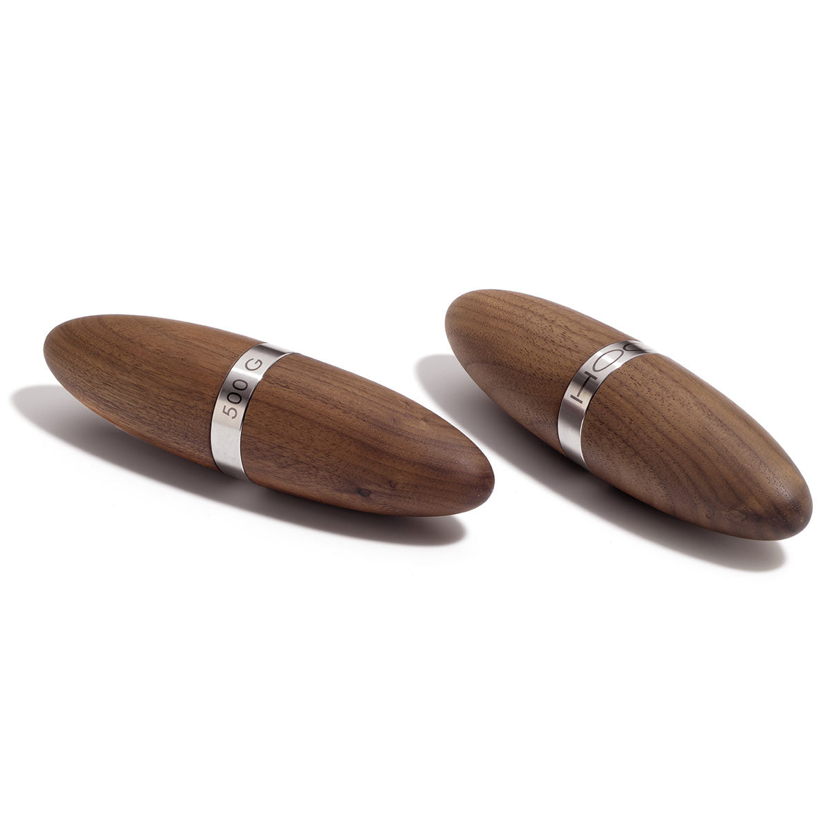 Edle Toninggewichte aus Holz. Sie halten sich fit durch Zumba, Stretching, Tanzen oder Fitness? Dann werden Sie begeistert sein von den Toninggewichten Robusto. Durch die besonders anschmiegsame, ergonomische Form liegen die Toninggewichte ungewöhnlich gut in der Hand und sehen ausgesprochen edel aus. Die Toninggewichte haben ein Gewicht von je 500 g und werden im Set geliefert. Sie folgen der Form der Innenhand und sind ideal geeignet für eine Vielzahl an Trainingsarten. Es wird nur einwandfreies amerikanisches Nussbaumholz aus nachhaltigem Anbau verwendet. Durch einen diffizilen Prozess wird das Holz ausgehöhlt und im nächsten Schritt konisch fein gedrechselt, geschliffen und poliert. Anschließend wird das Holz durch die Oberflächenbehandlung mit Naturöl veredelt. Die Toninggewichte sind völlig unbedenklich bei Hautkontakt. Es wird stets auf höchstmögliche Exaktheit geachtet, um die Spaltmaße so gering wie möglich zu halten. Ein massiver Ring aus Edelstahl wird fein geschlichtet und sorgt für einen edlen Kontrast und eine faszinierende Lichtbrechung am Edelstahl. Die organisch warme Holzoberfläche und der Edelstahlring bilden eine harmonische Einheit. Die konische Form und der Name Robusto sind auf die klassische Zigarrenform zurückzuführen.